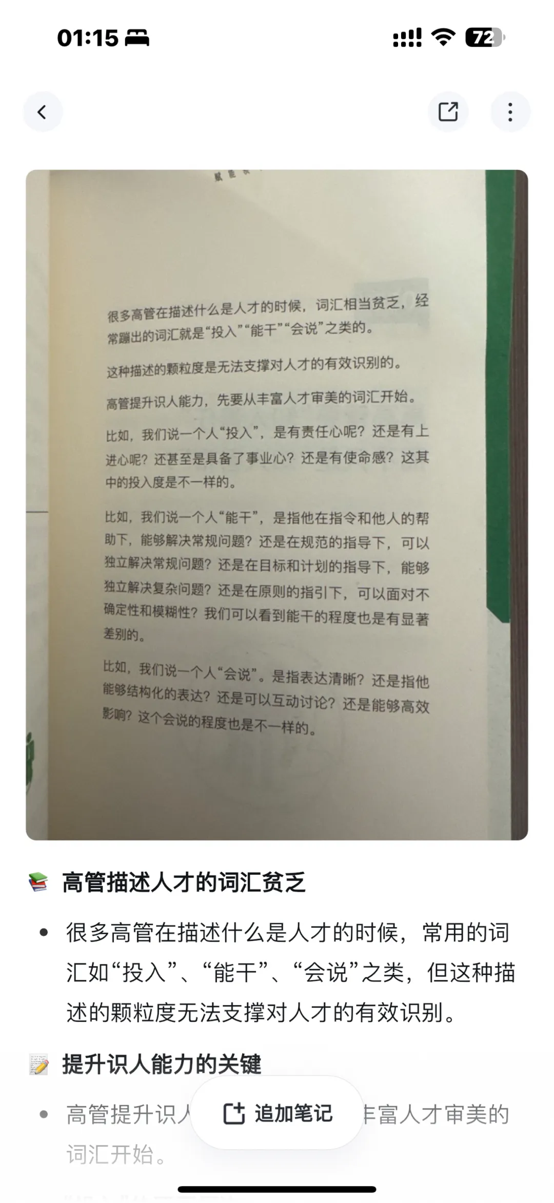 对于经常阅读纸质书的小伙伴,可以用这个软件拍下内容,它就会保存页面,并借助 AI 整理出核心内容,如下图: