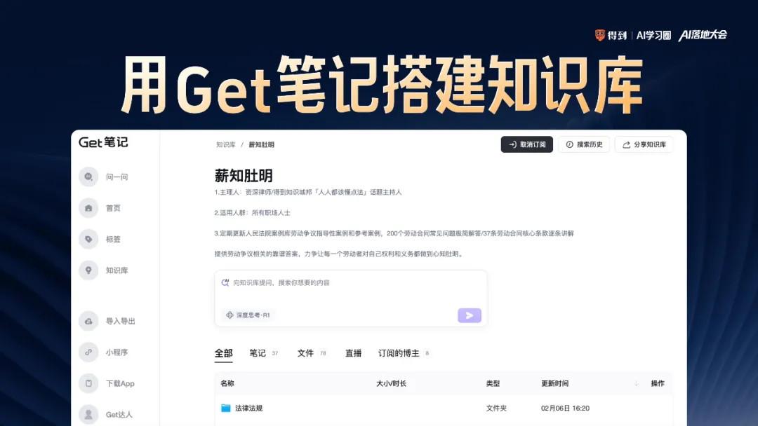 我在AI学习圈的一门课里找到了答案,这门课叫《如何用Get笔记搭建AI知识库》——对,知识库,就是解决像法律这种垂直专业领域知识问答的最佳方案。与其让AI“放飞自我”,不如给它设定一个明确的框架,让它在我给定的范围内发挥能力。