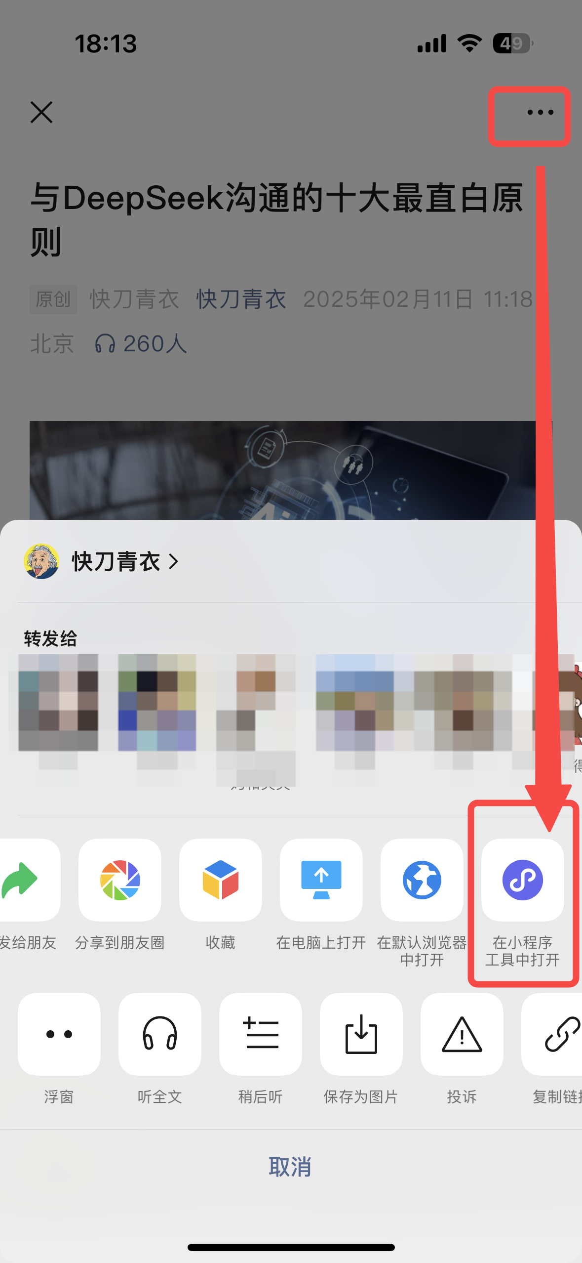 【选择链接】点击页面右上角的…,左滑找到并点击