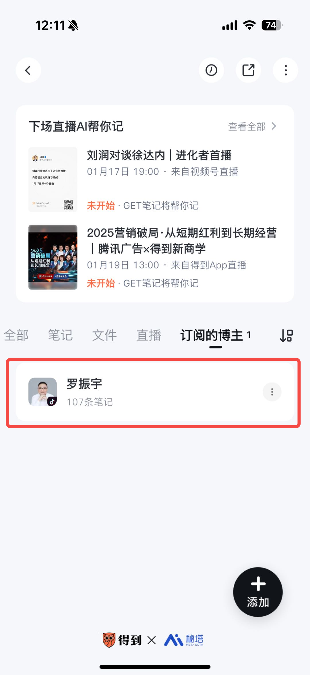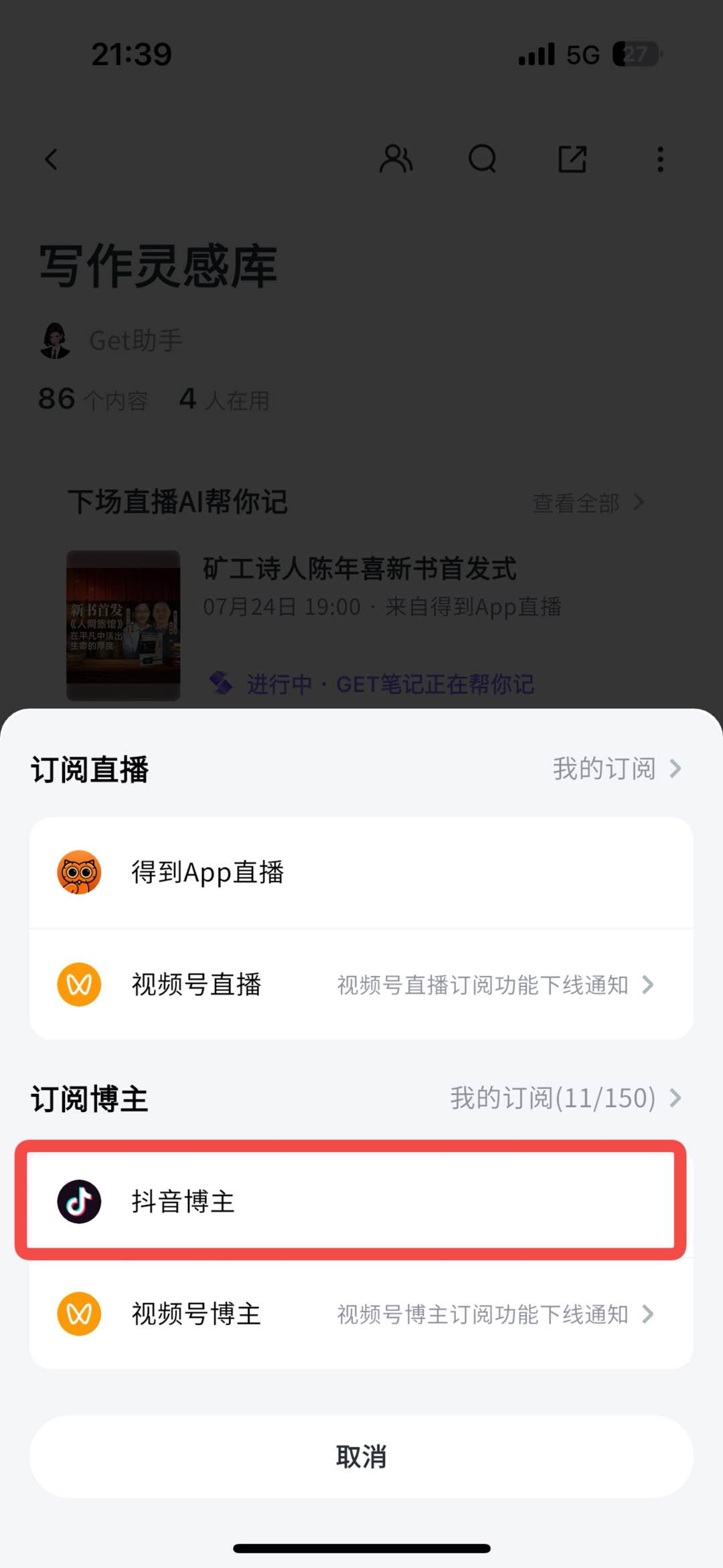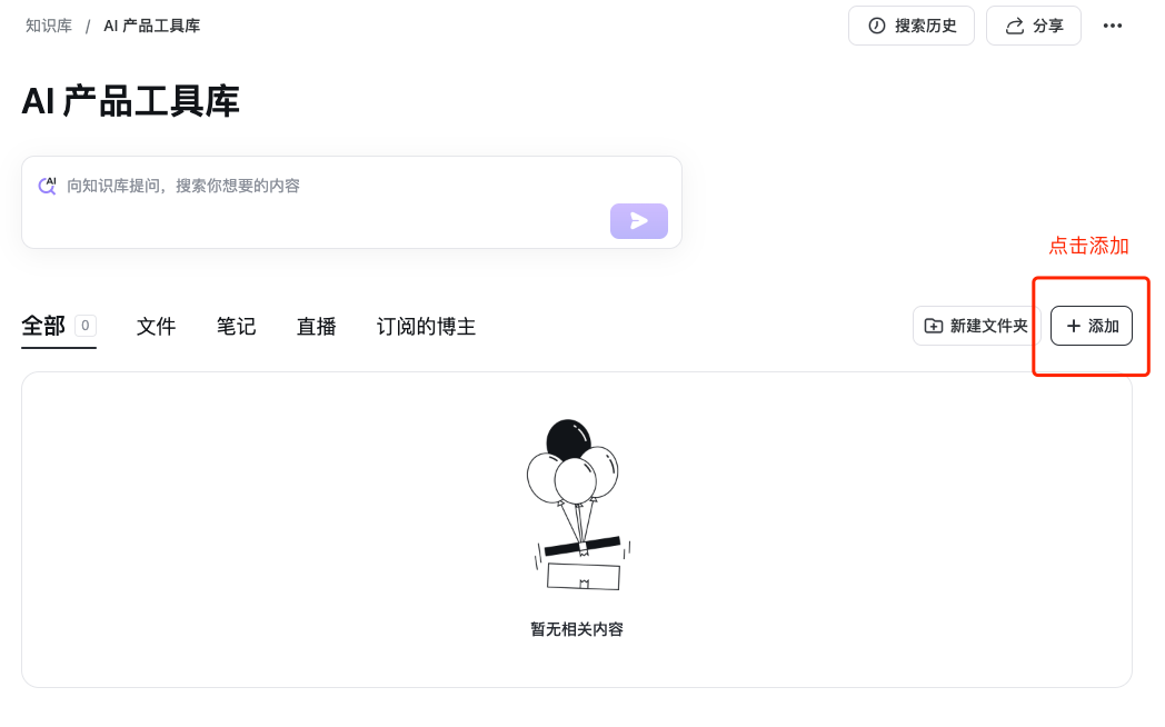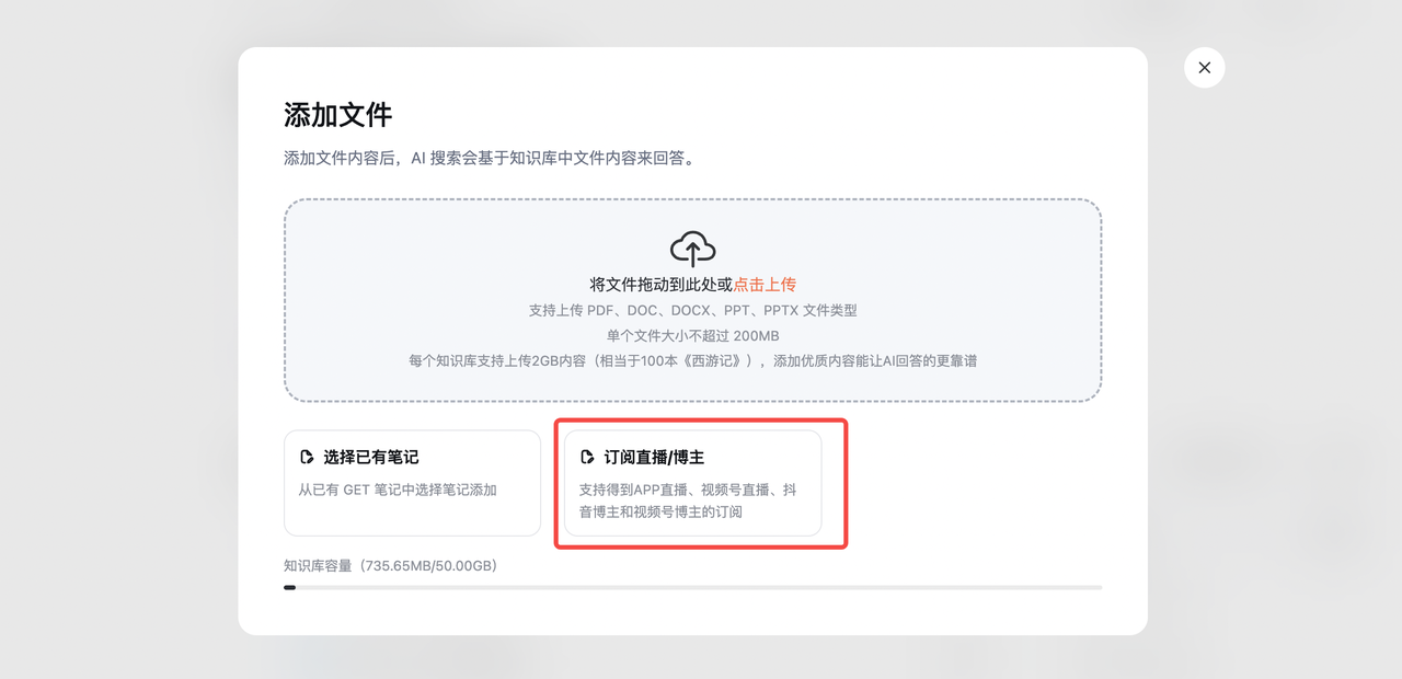 - 创建一个个人知识库,在知识库内,点击“添加内容”按钮,并选择“订阅直播/博主”