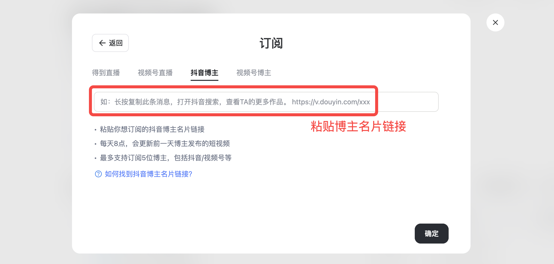 直接粘贴抖音博主的主页链接即可订阅👉如何找到抖音博主名片链接?
