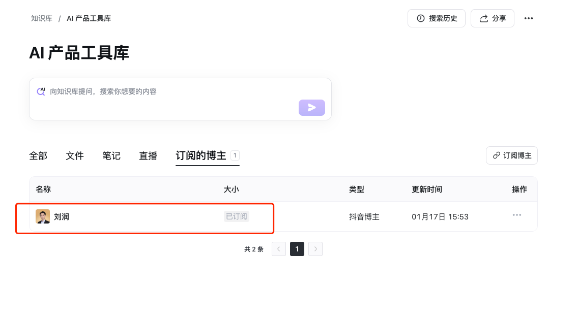 - 进入你创建的知识库,点击“添加”按钮,选择“订阅直播/博主”
