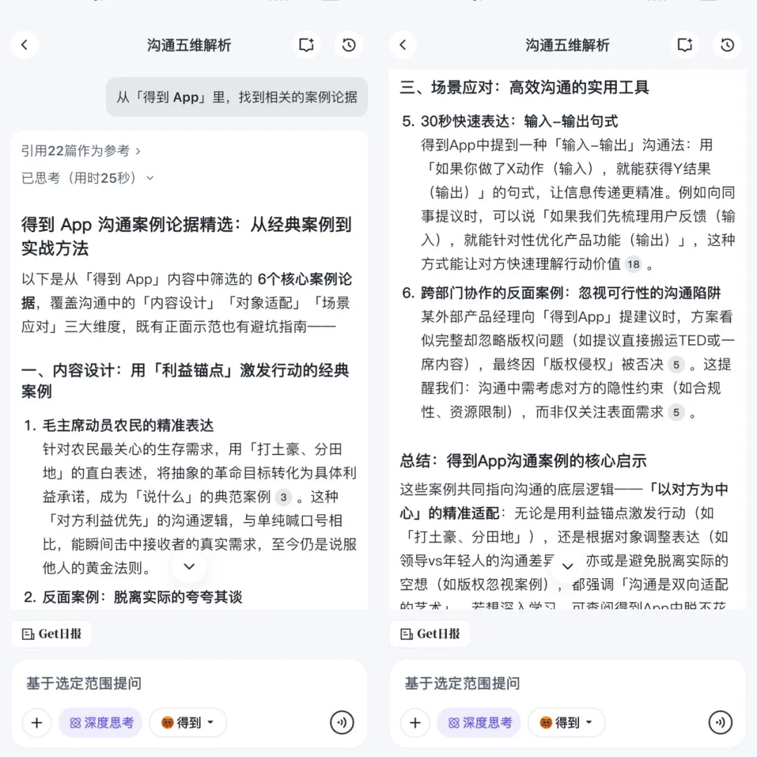 比如我最近在梳理一套沟通的基本框架,希望找到一些质量比较高的案例,于是,我就在对话中,请它:从「得到 App 」里,找到相关的案例论据。