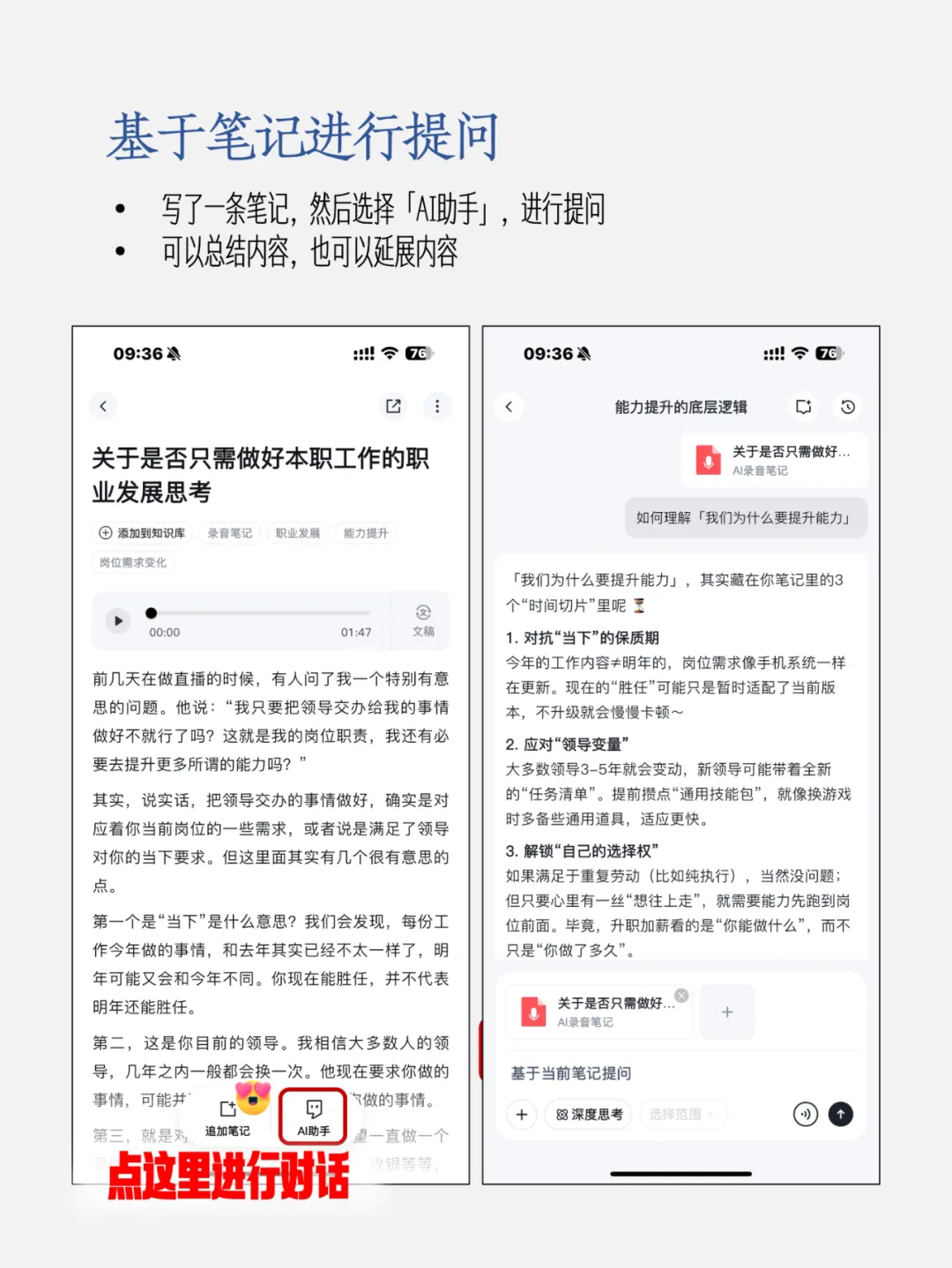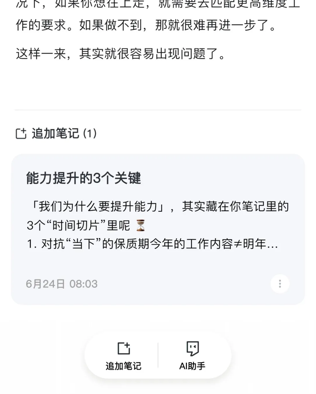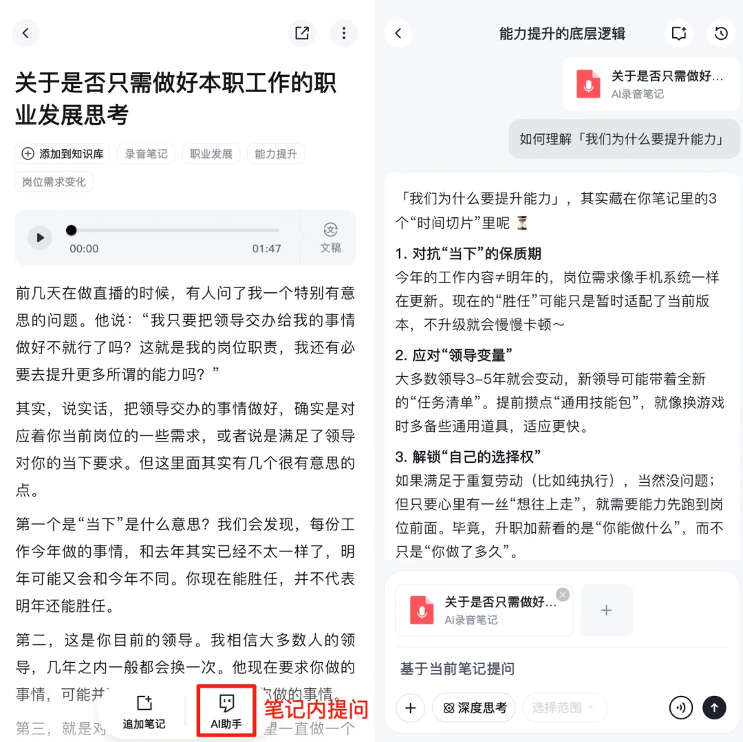 记录之后,我发现自己说得有点啰嗦,于是就在笔记内,选择了「AI助手」,并请它基于我的内容,说说:如何理解「我们为什么要提升能力」。