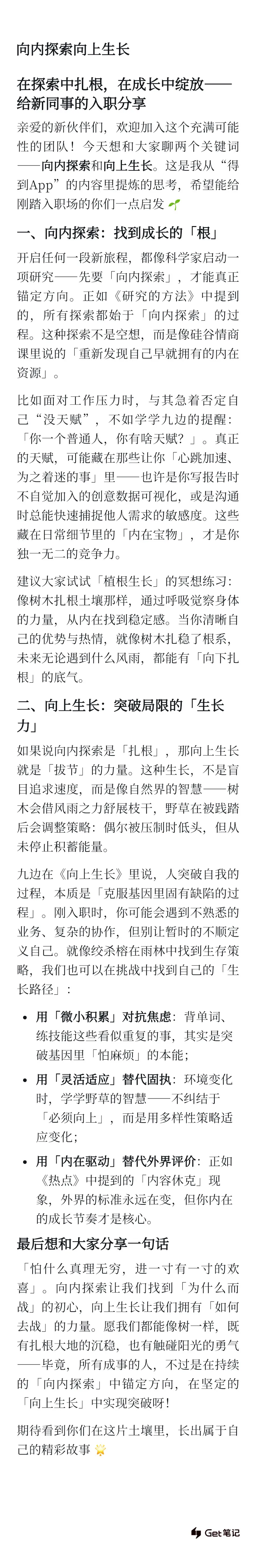 明天我要去跟新员工交流,请围绕「向内探索」和「向上生长」两个维度,基于「得到 app」中的内容,帮我写一篇发言稿。