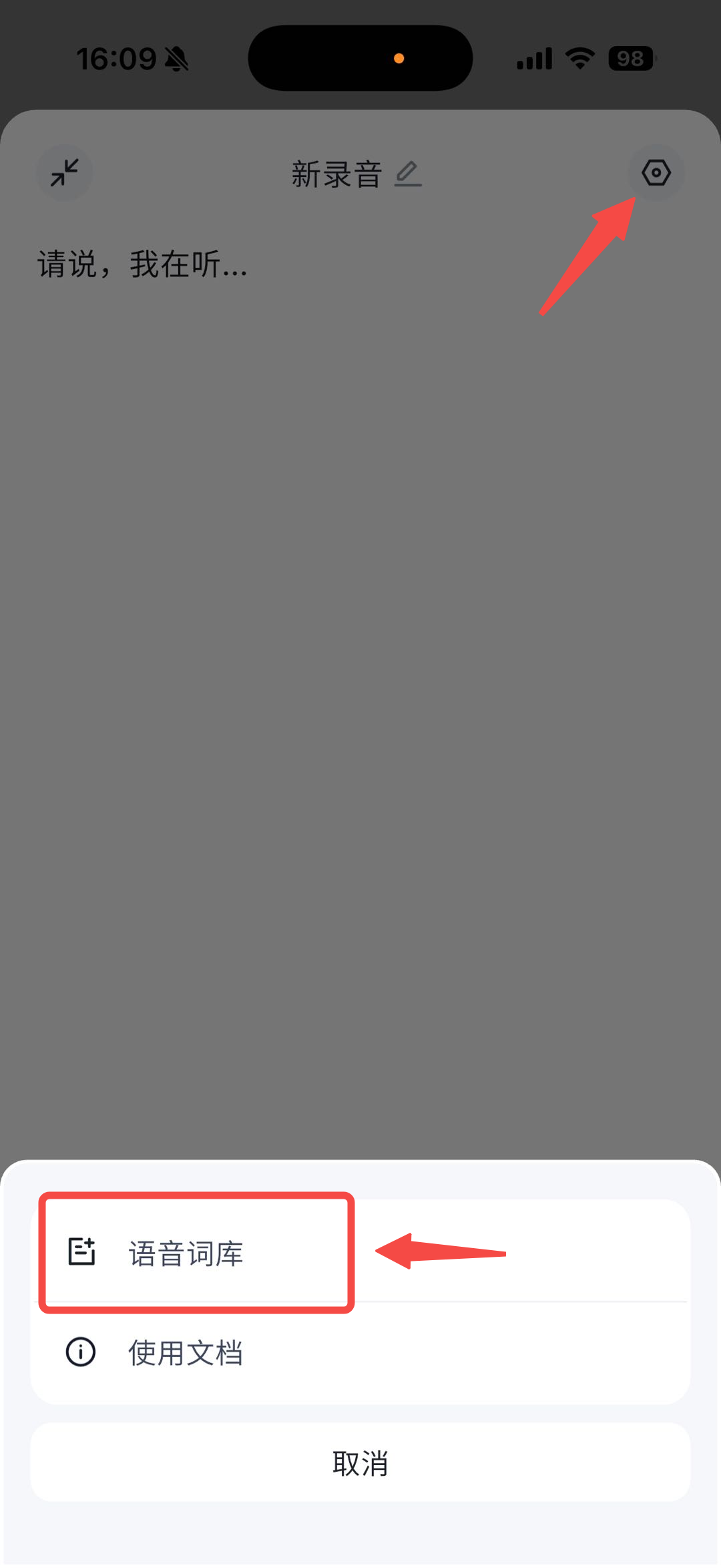 - 录音中,点击右上角设置按钮,也可进入语音词库