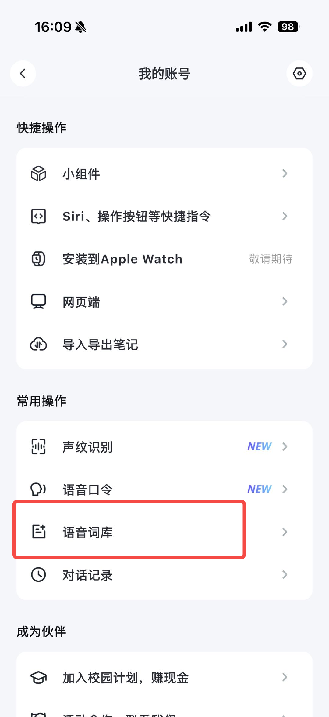 - 打开 App,点首页右上角菜单,点头像进入「我的账号」页面,在常用操作区域点击「语音词库」