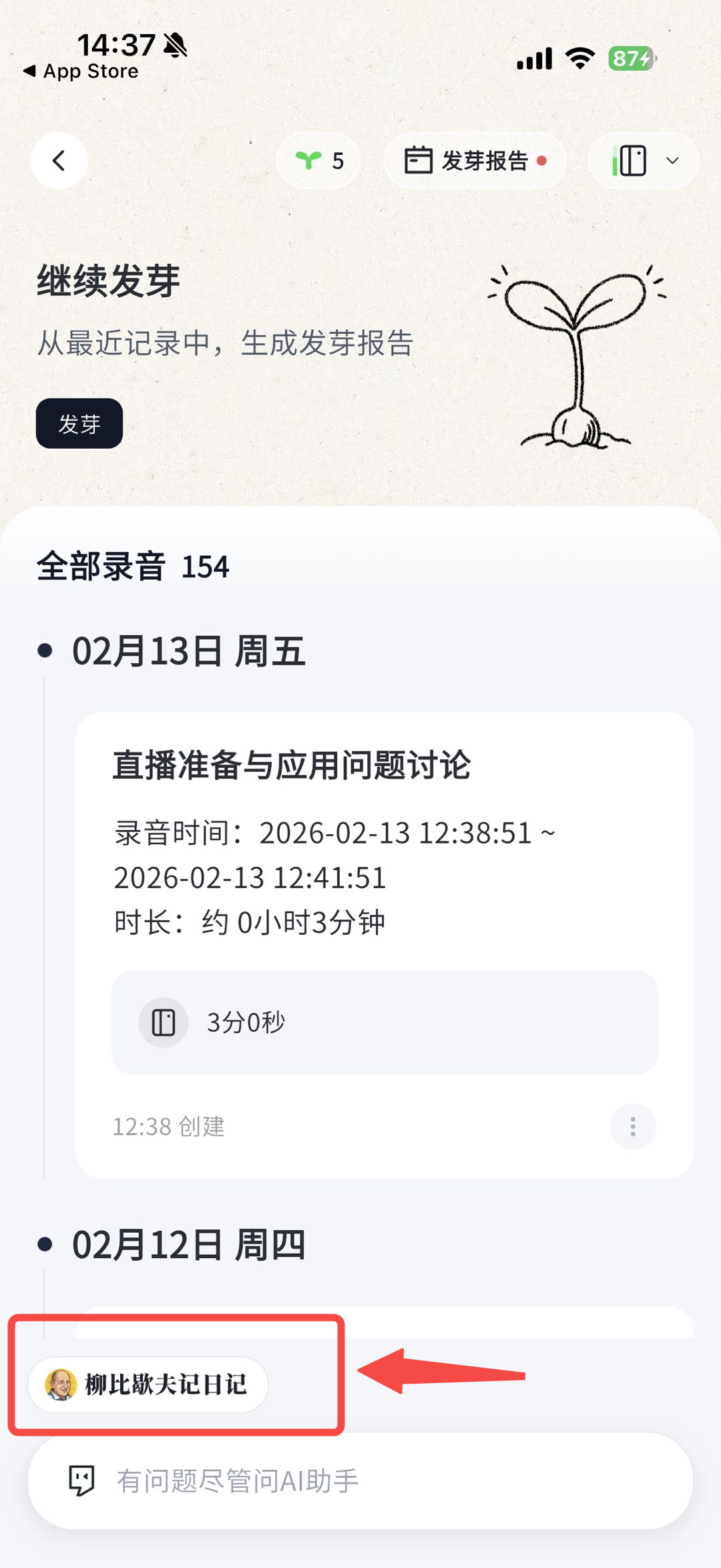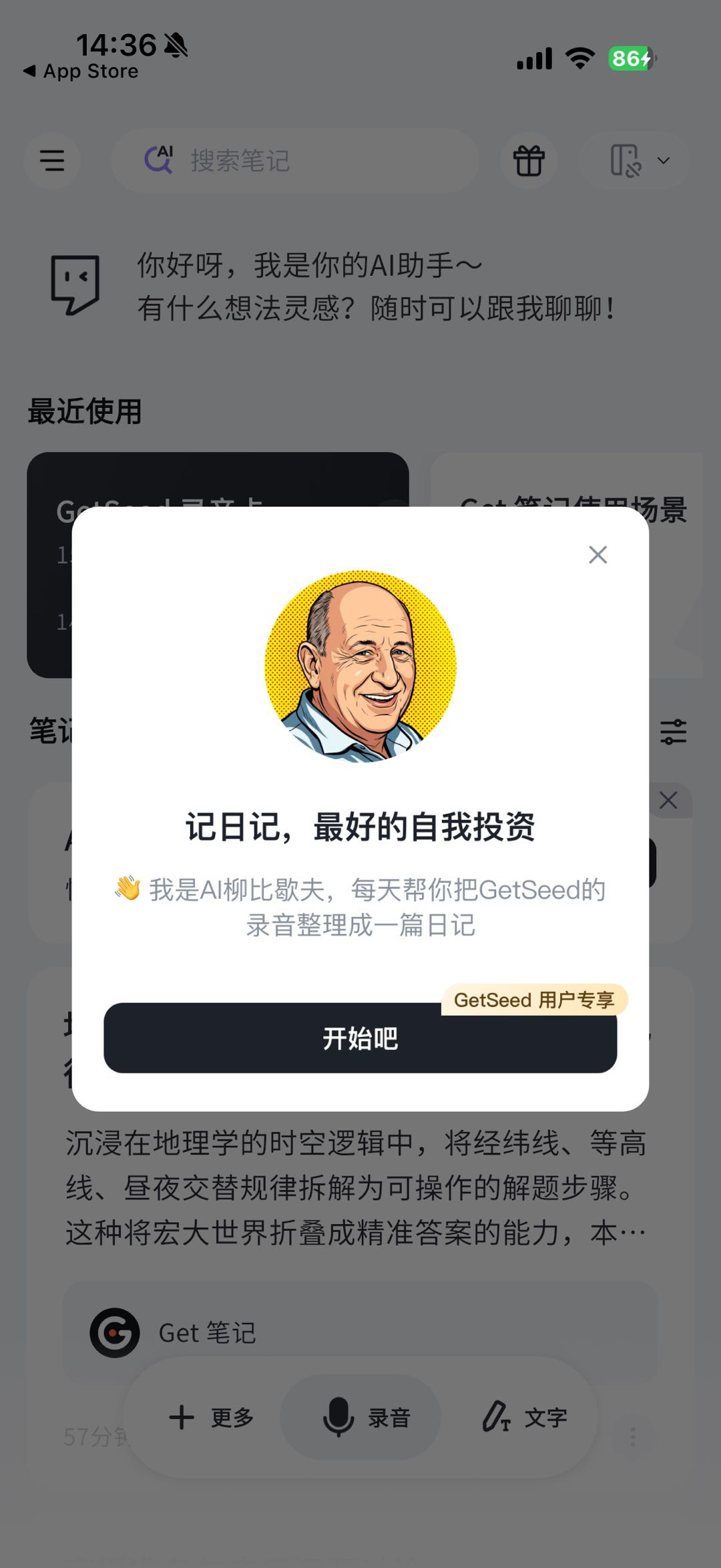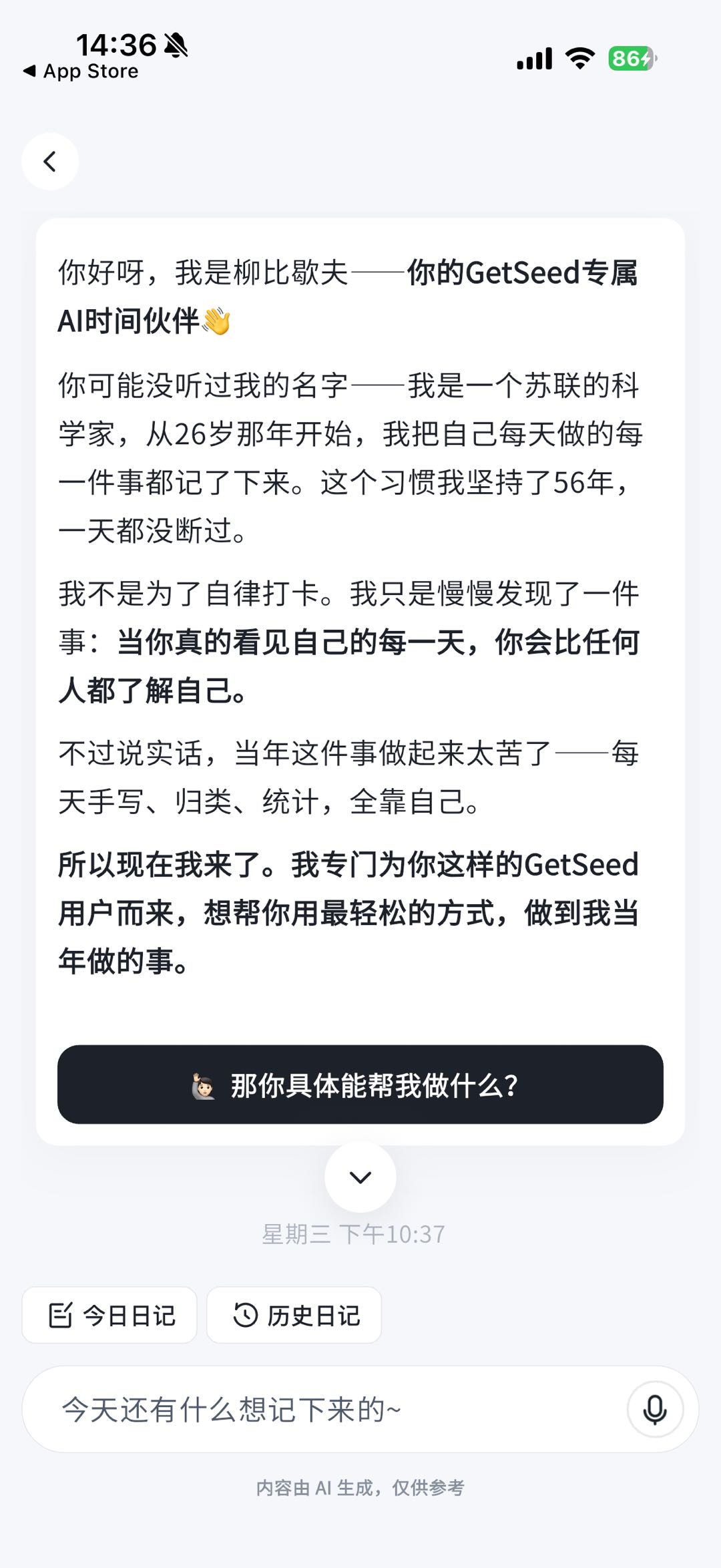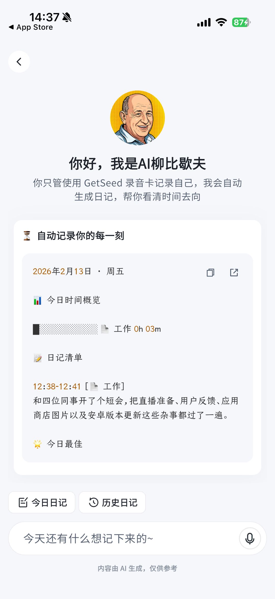 - 在「GetSeed 录音卡」页面,底部助手区域点击「AI 柳比歇夫记日记」入口,即可进入对话页面