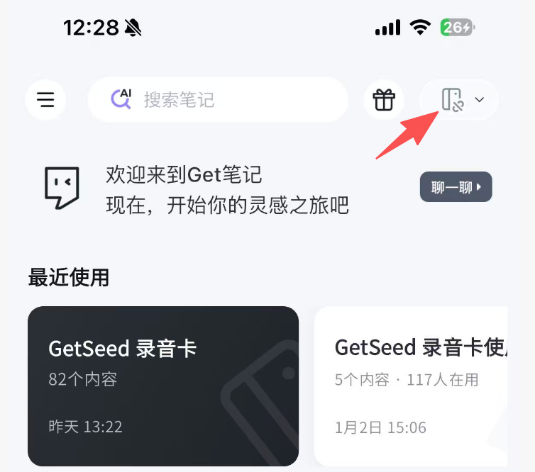进入Get笔记APP,绑定过录音卡的,首页右上角会展示设备入口,设备展示灰色,表示未连接,设备展示绿色,表示已连接。