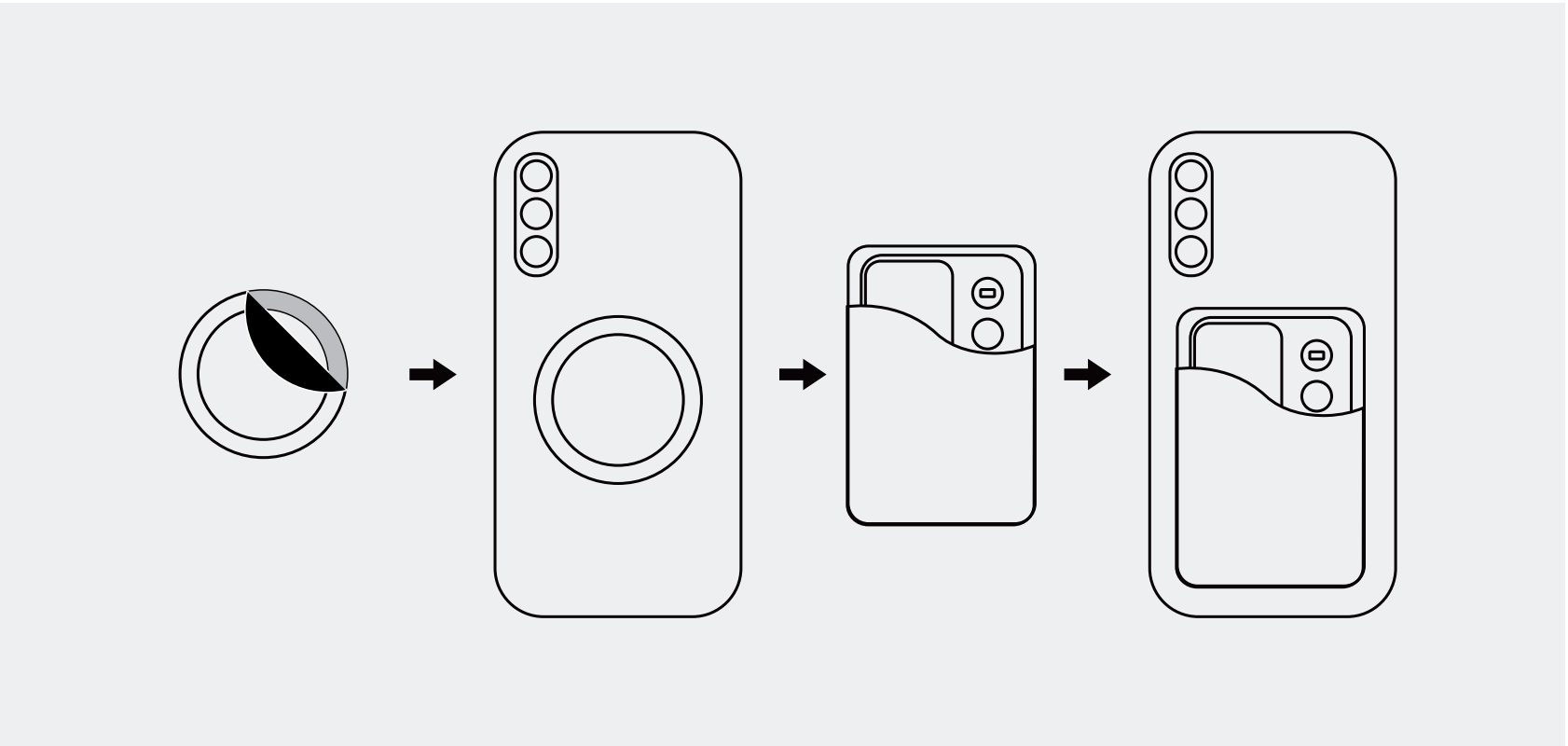贴圈后吸附:撕下磁吸圈背胶保护膜,将磁吸圈贴于手机背部合适位置,再吸附卡套。
