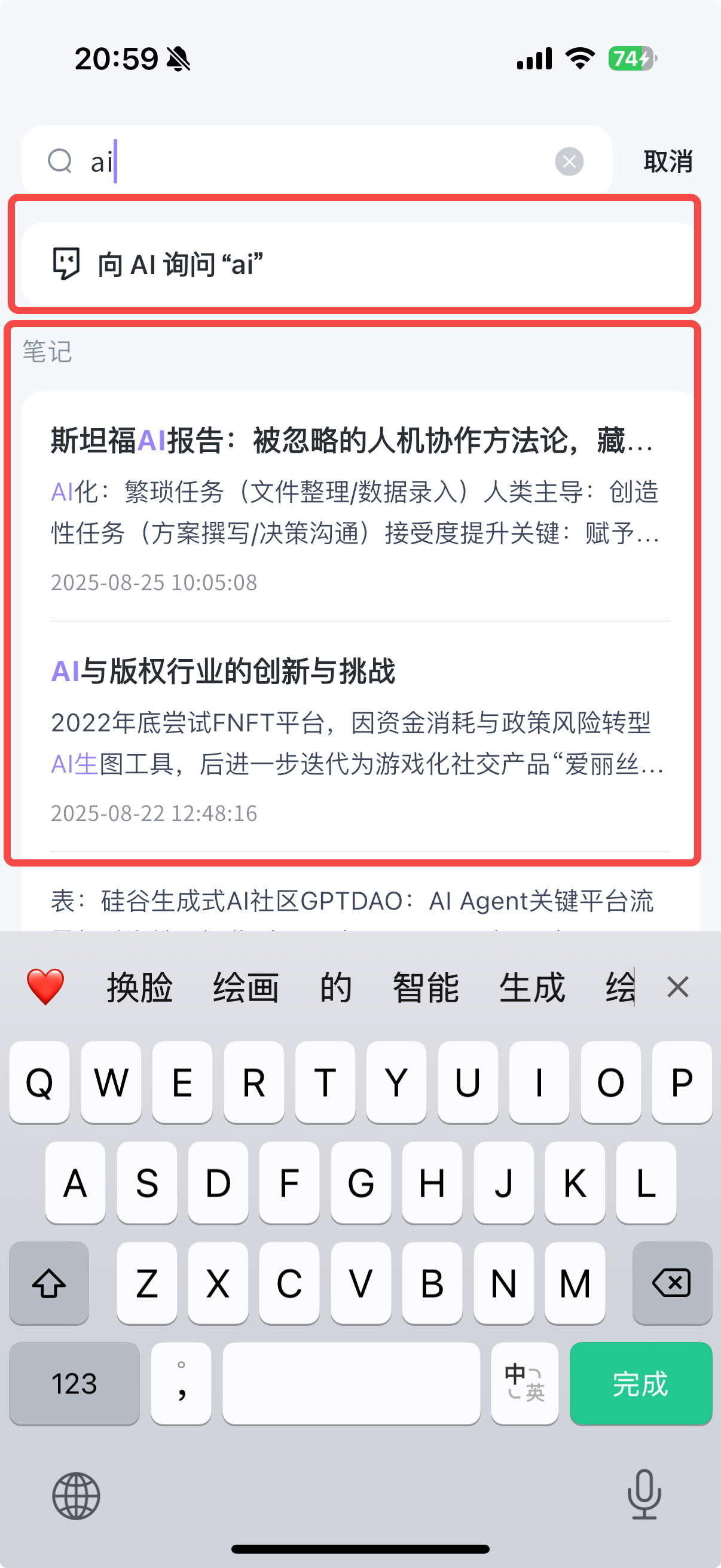 可以直接输入关键词,会自动将匹配的笔记展示在下方
