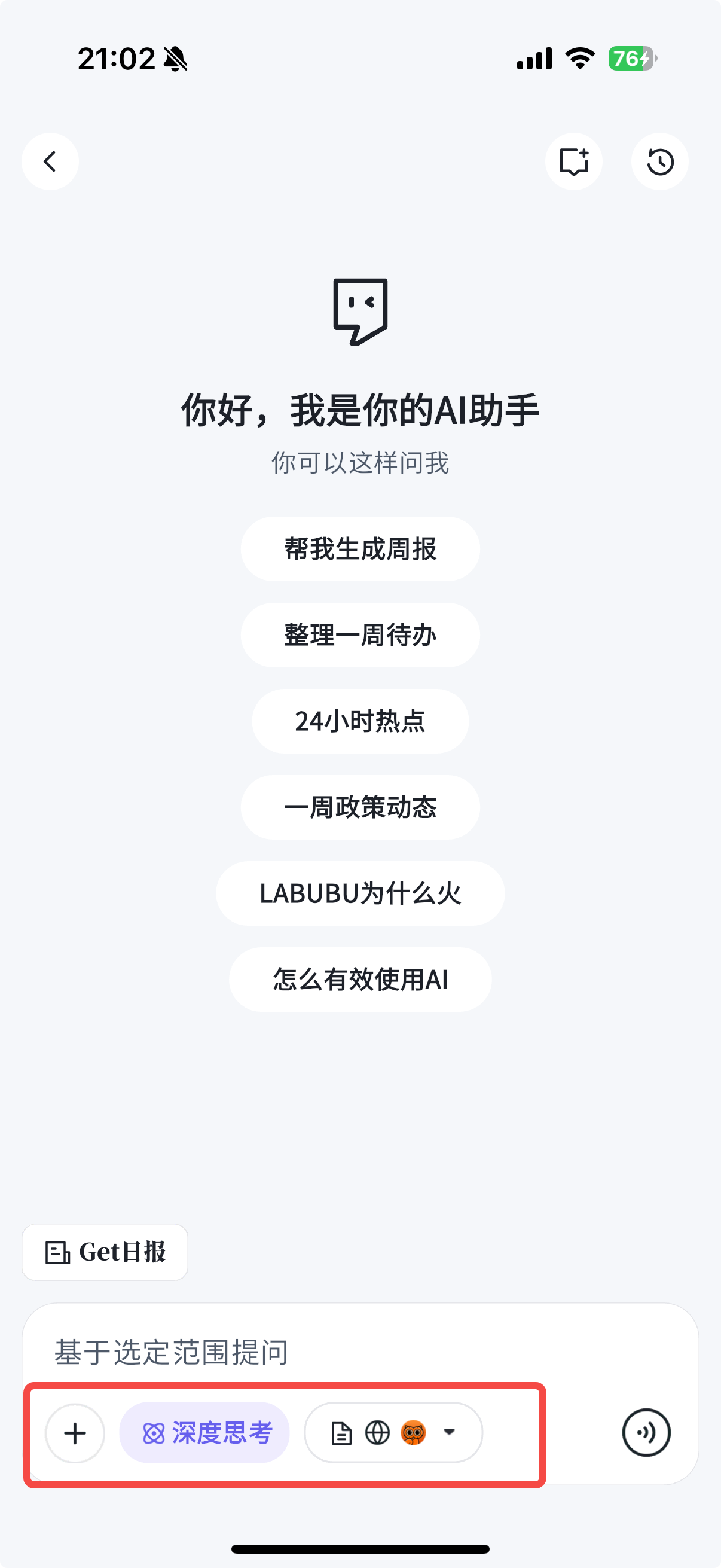 点击顶部 AI 助手的聊一聊按钮,即可进入与 AI 助手的对话页面;