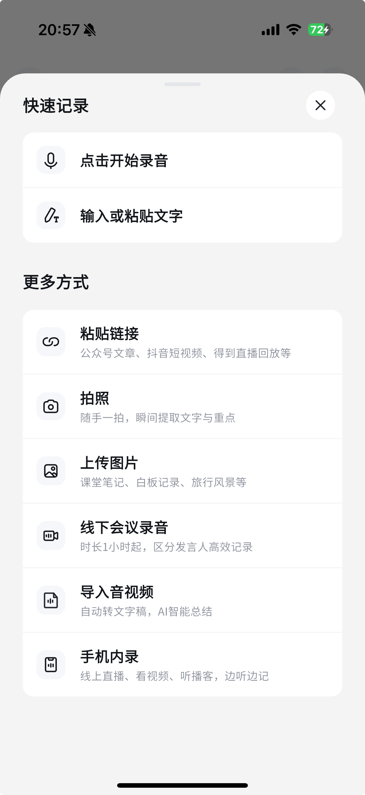 - 视频链接:抖音短视频、B站视频、小红书视频、得到直播回放(需要使用得到App中的分享链接)等