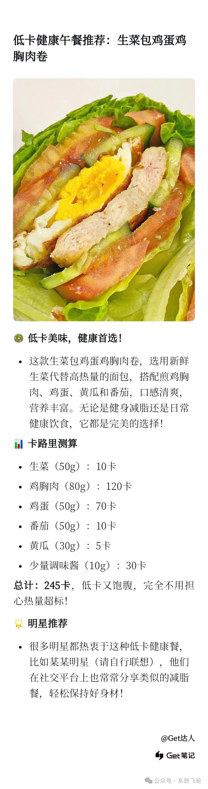 再假设我的角色定位是减脂教练、正在减肥人设,对提示词进行修改。这样,Get笔记就会按照要求生成适合推广文案内容。你看,里面包含每类食物卡路里都有标明,总的卡路里也计算出来了,是不是完全满足了推广要求?而且,由于在提示词中我提出了补充明星以加强推荐效果的要求,所以在文案中把需要补充的位置预留了出来。