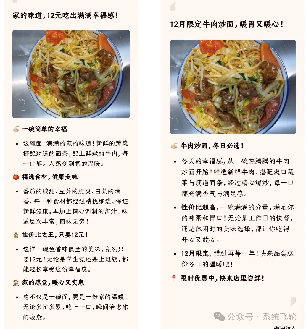 我再分享一个创作思路。我朋友经营着一家牛肉面点店,根据他的实际情况和需求,短短几分钟便分别完成了小红书和微信两个平台的推广文案。当然,还可依据需求或场景的变化,源源不断地生成新文案。我已将这两个文案的截屏放在下方,供你对比查看。