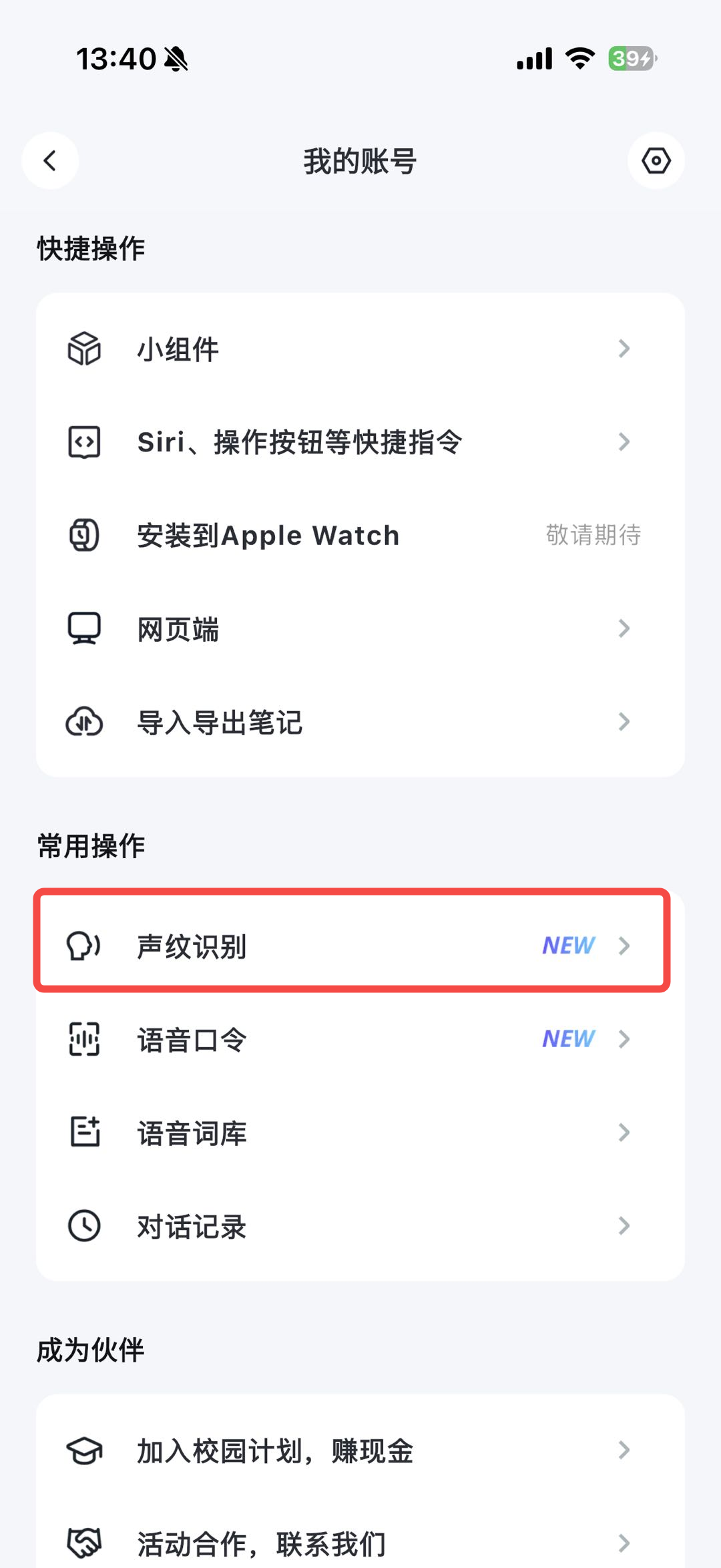 - 打开 App,首页左上角菜单点头像,进入「我的账号」页面,在常用操作区域点击「声纹识别」