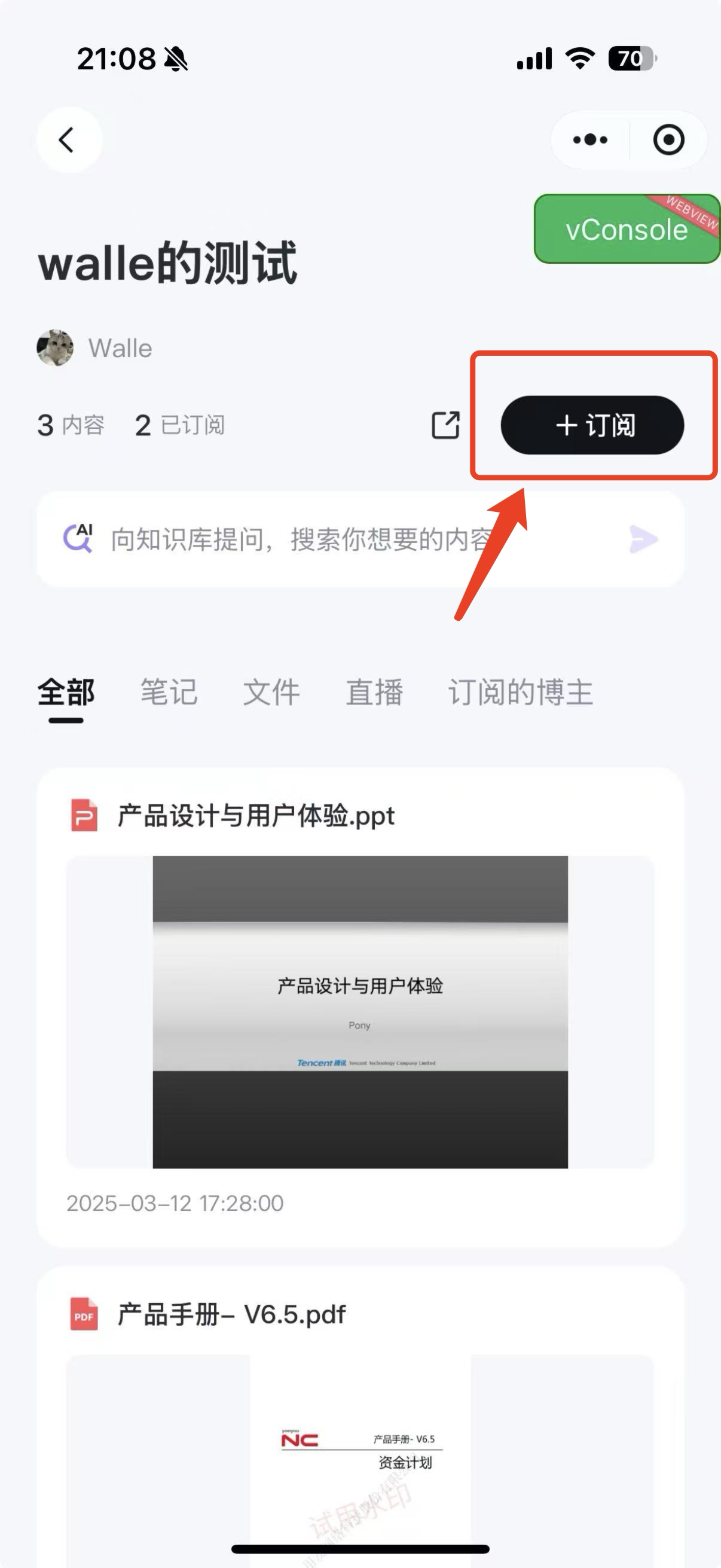 - 打开别人分享给你的知识库,点击右上角“订阅知识库”