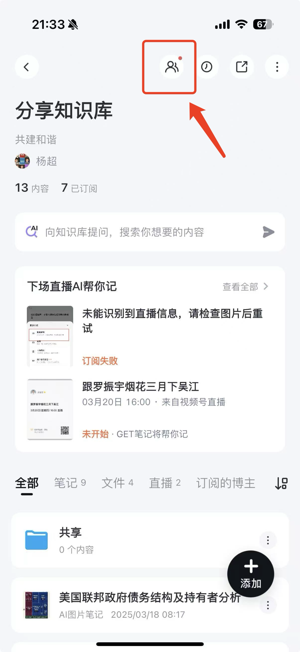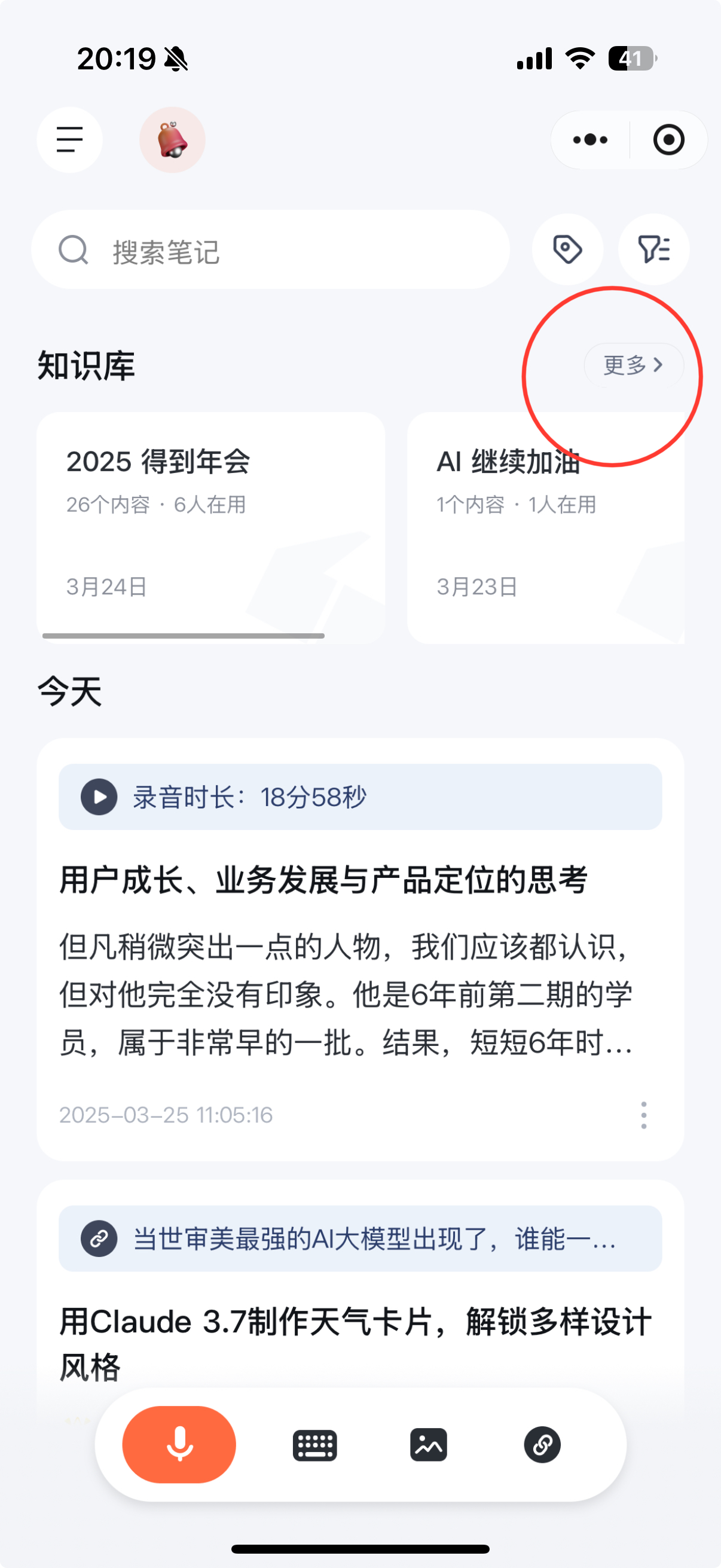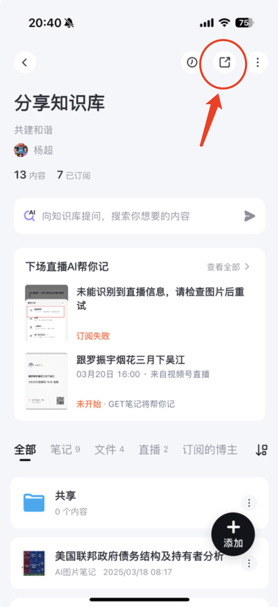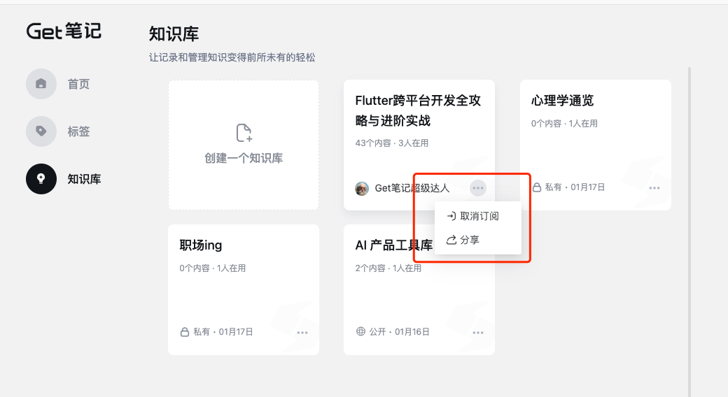 - 进入Get笔记小程序,点击右上角更多,可以进入知识库列表页