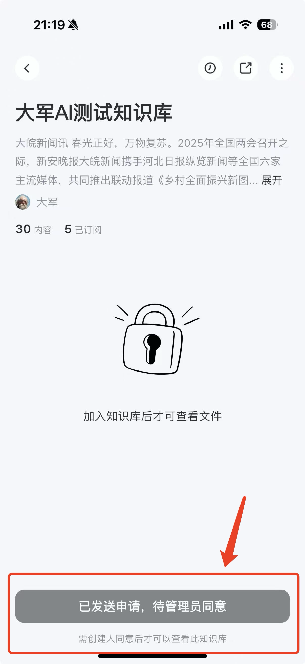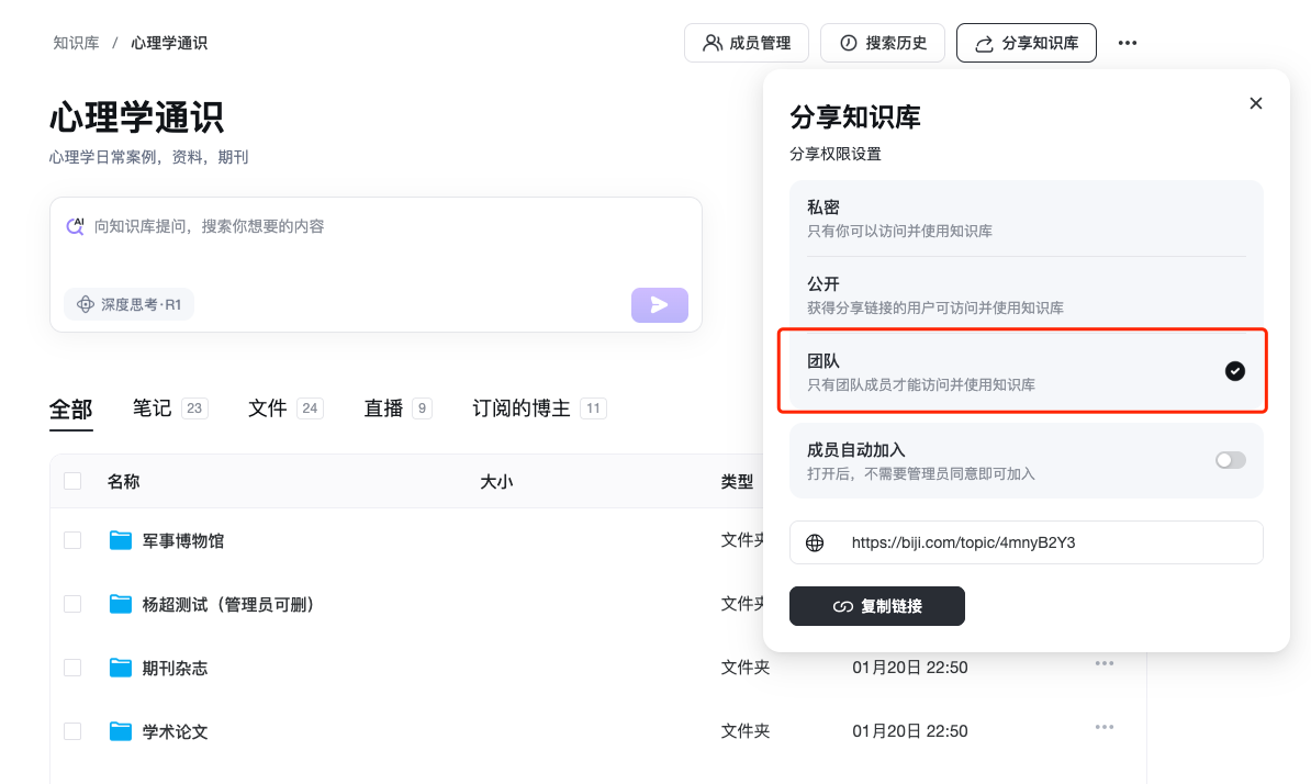 - 团队,则获得你的知识库分享链接 or 分享海报的人,无法直接访问知识库内容,需要先申请加入才能使用