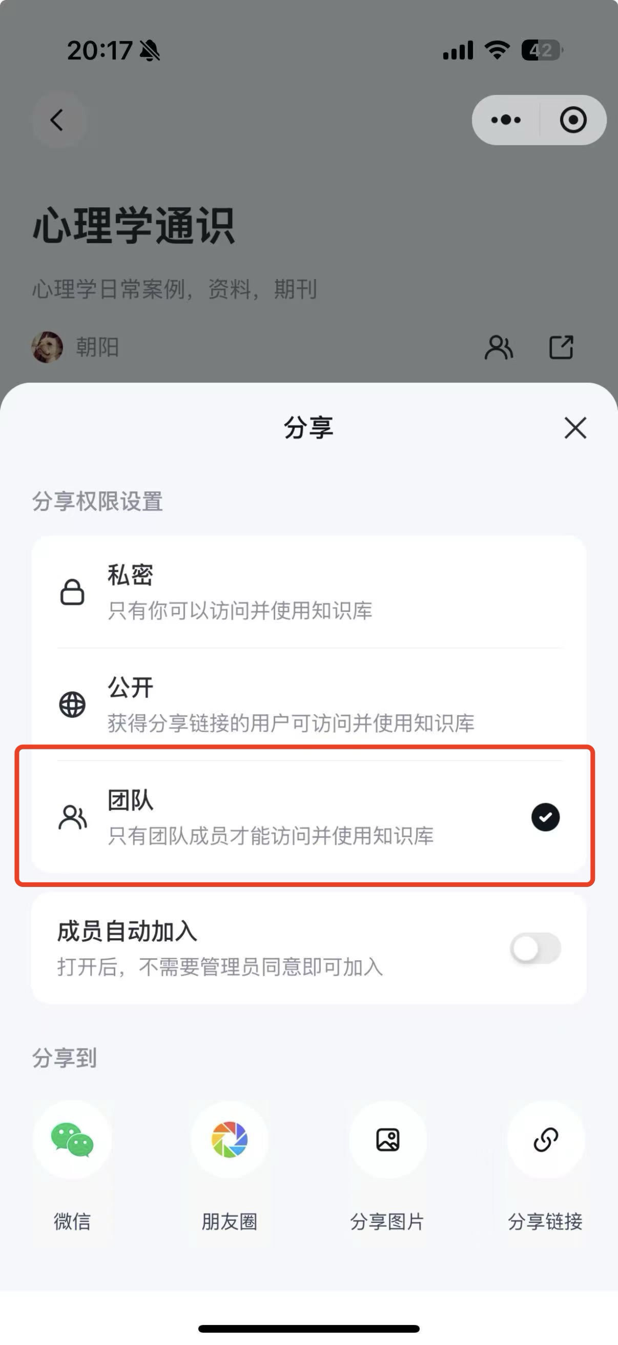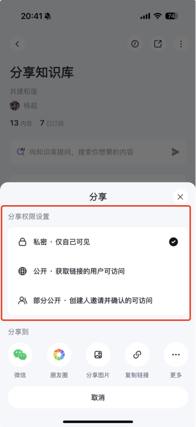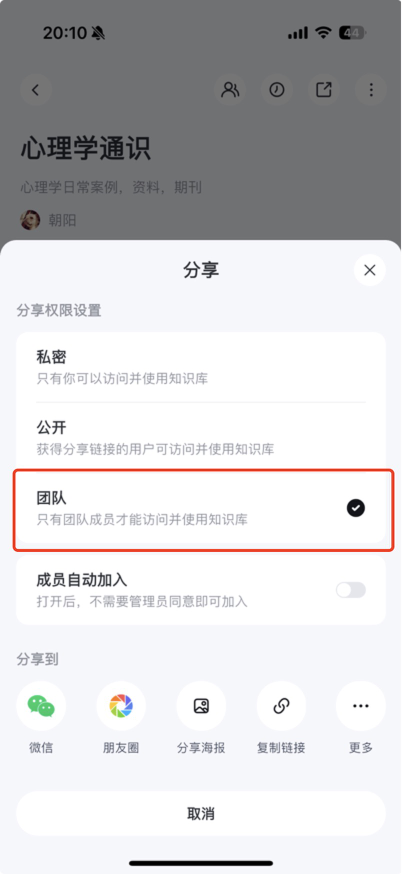 - 选择“团队可见”,然后将知识库通过「微信好友」、「朋友圈」、「分享海报」和「分享链接」等形式分享出去