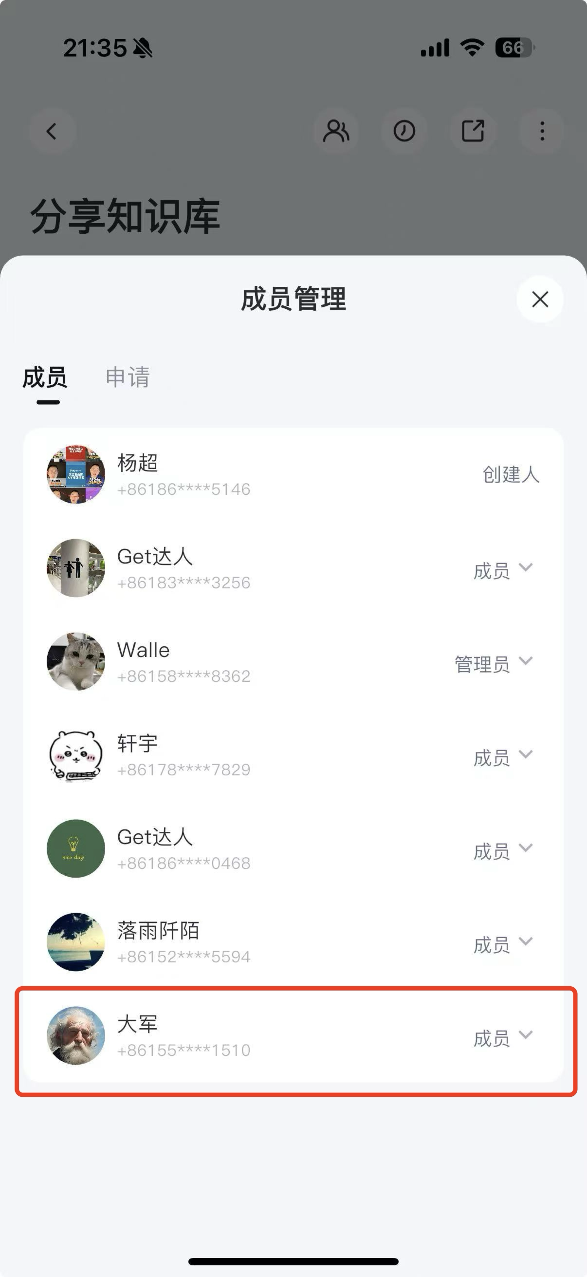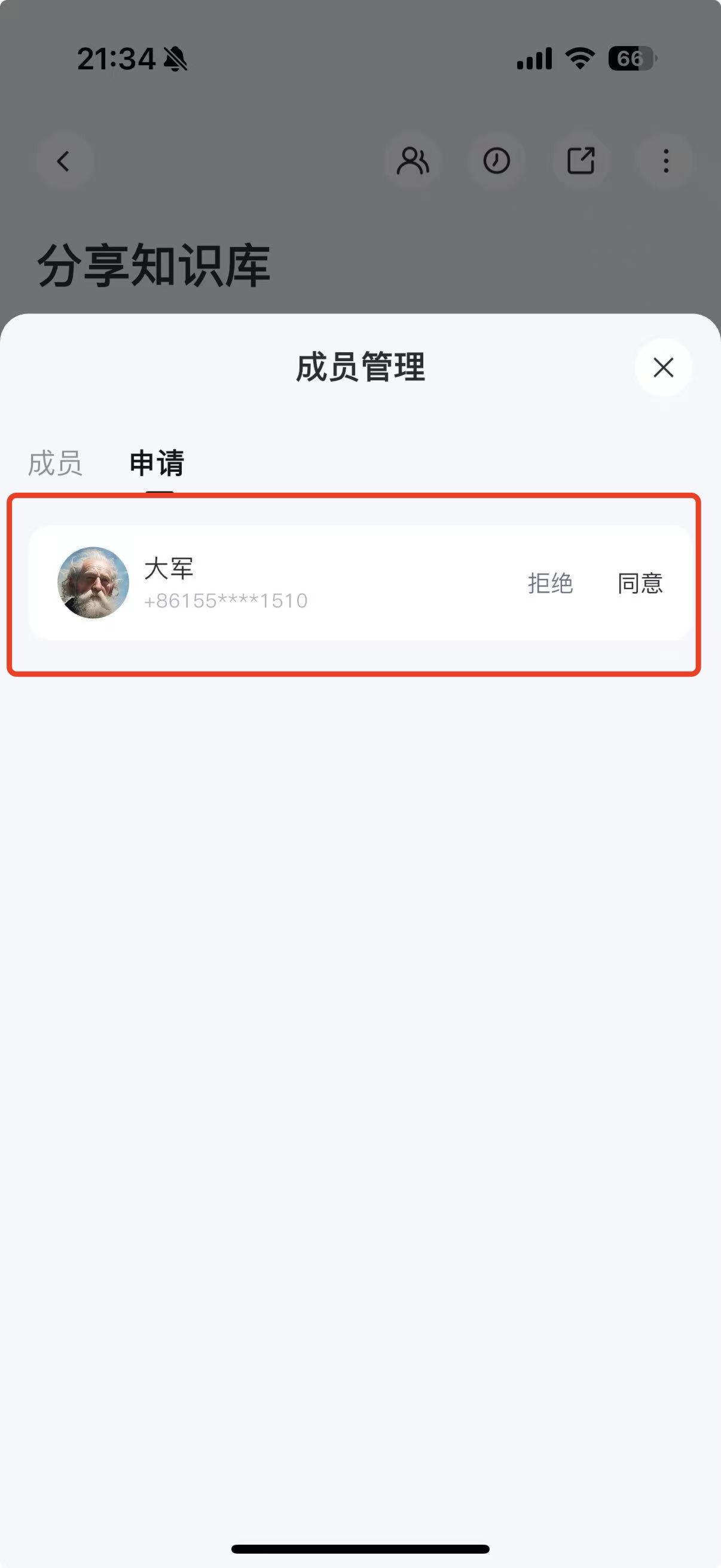 - 有新的成员申请加入时,知识库顶部成员入口会有红点提醒,点击“成员”入口进入成员管理页面