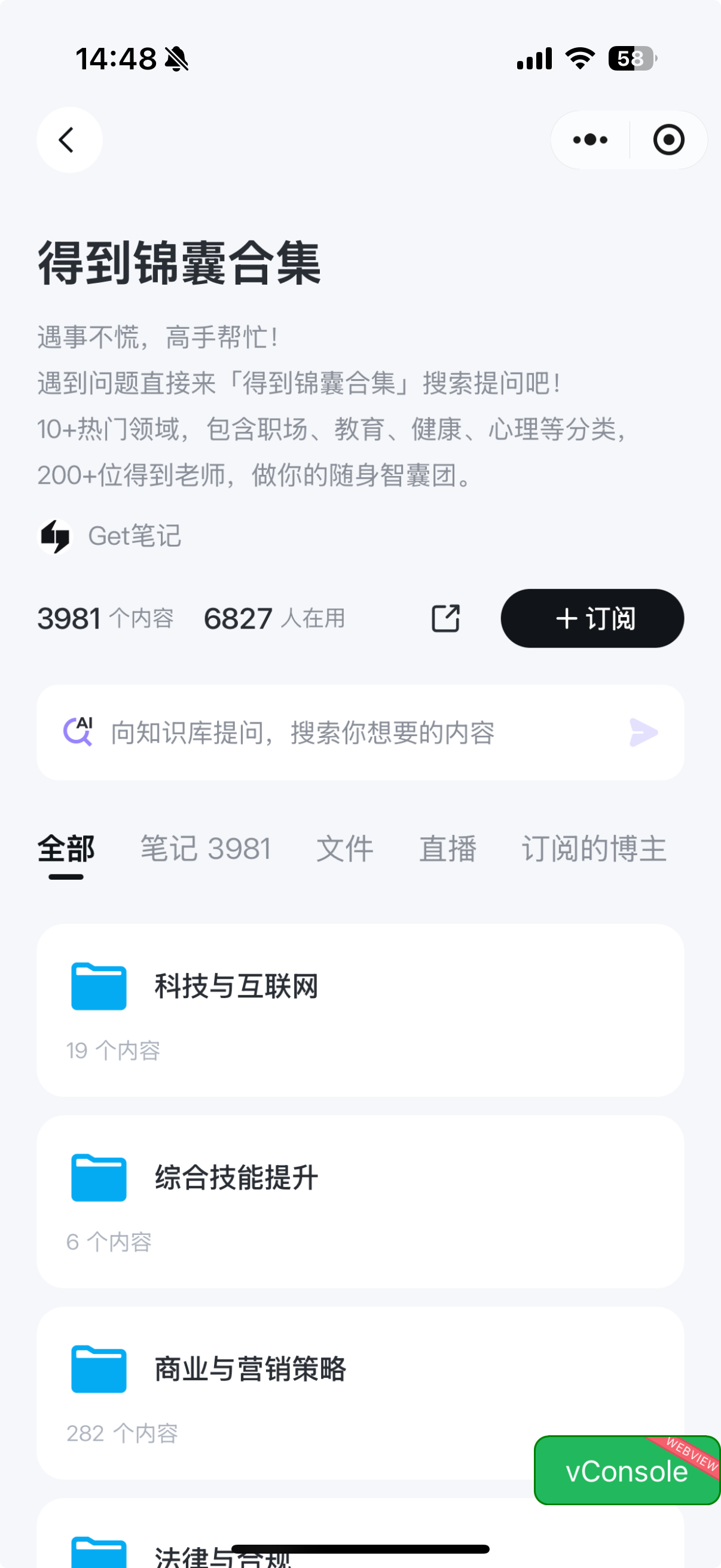 - 同时,你也可以在精选 tab 下,点开官方精选知识库,并点击“订阅”按钮,完成订阅