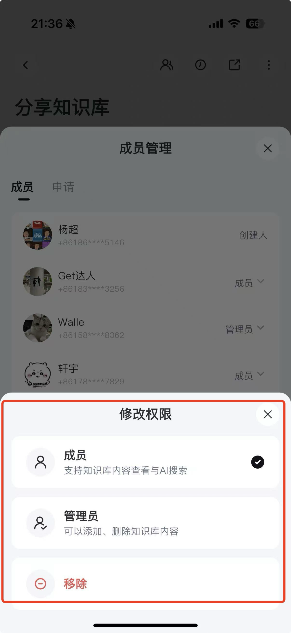 - 同时,可以将已加入的成员,从知识库移除,则其无法再正常访问和使用知识库