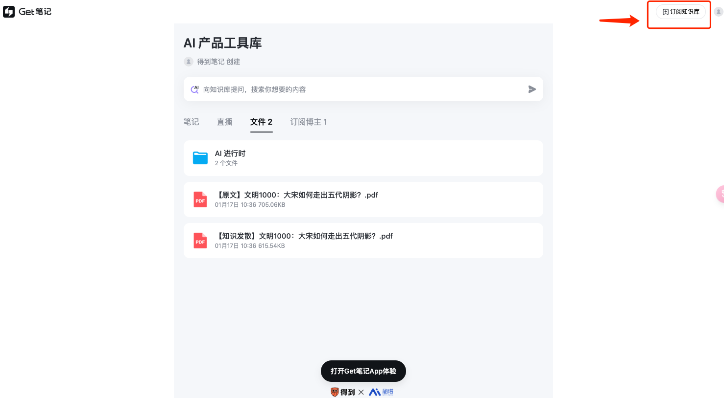 - 点击进入知识库页面,可以点击“+订阅”,订阅后的知识库,会出现在「我的」知识库列表内