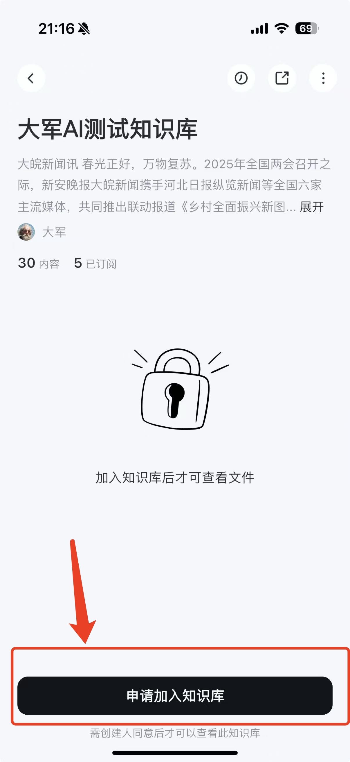 - 其他成员点击进入知识库页面,可以点击“申请加入知识库”,然后等待知识库管理员的审核即可