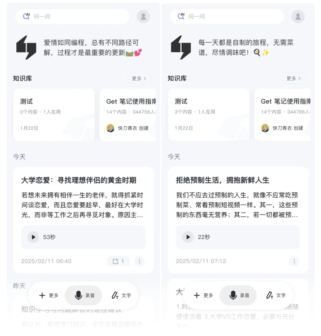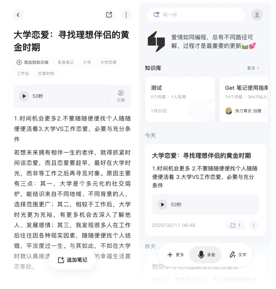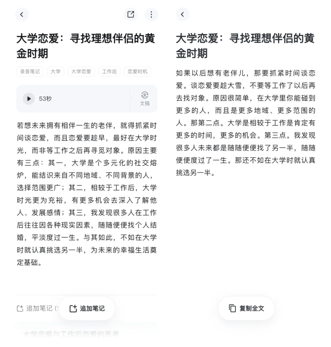 Get 笔记会同时保存你的语音、语音原始文字稿(右图)、AI 润色稿(左图)。体会一下。