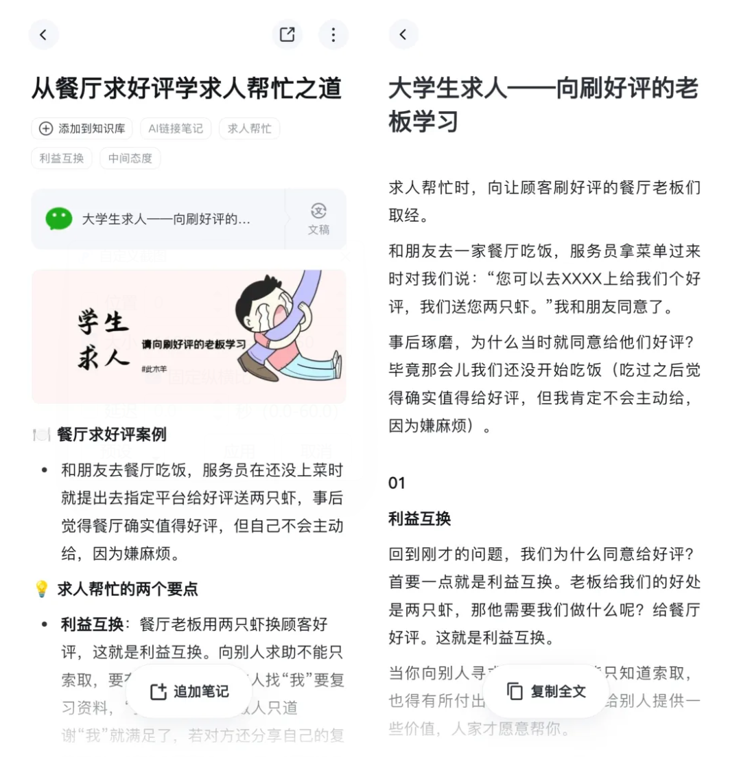 看看对公众号文章的剪藏(左图为原链接 、AI 总结,右图为原文解析):