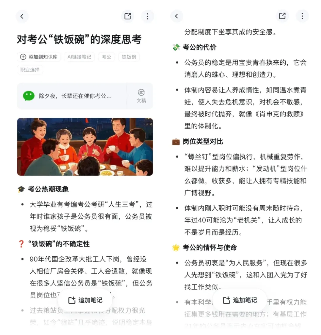 它接入了 Deepseek-R1!当你向 Get 笔记提问时,它能根据你的笔记、Deepseek-R1 的深度思考,生成一篇文章,生成真正的回答(如下图所示,从左到右,从上到下)!