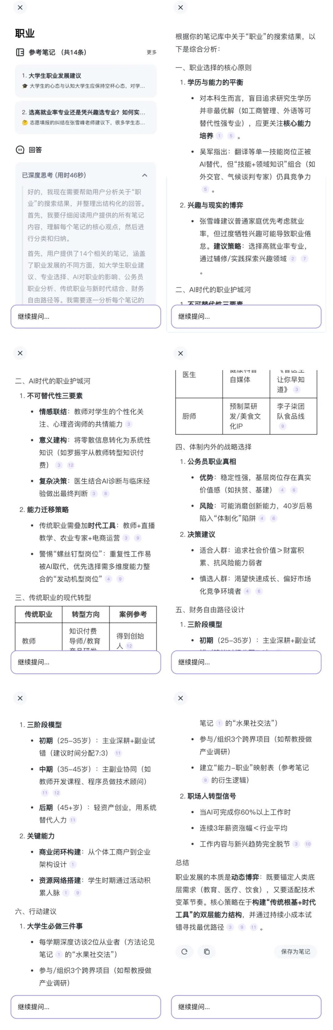 举个例子,我想进行职业规划,问 Get 笔记,第一次先问个大范围,只输入“职业”,这样你能看到更多关联性的回答。第二次问小范围,问具体一些,“我在教育行业 10 年,已成为教学主任,我该如何继续进行职业发展”,相信我,把这种具体的问题给 Get 笔记,它的回答出乎意料!