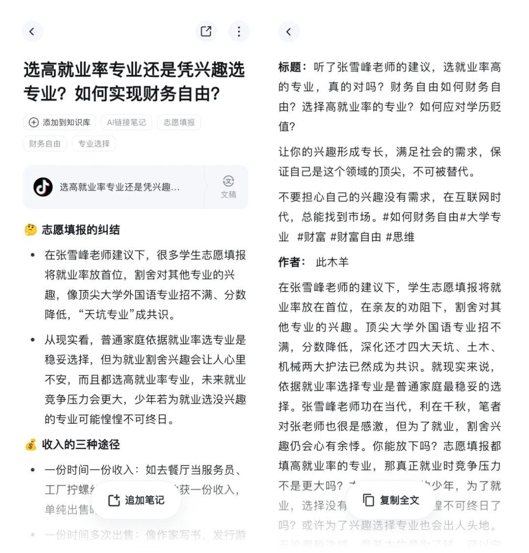 看看对抖音视频的剪藏(左图为原链接 、AI 总结,右图为原文解析):