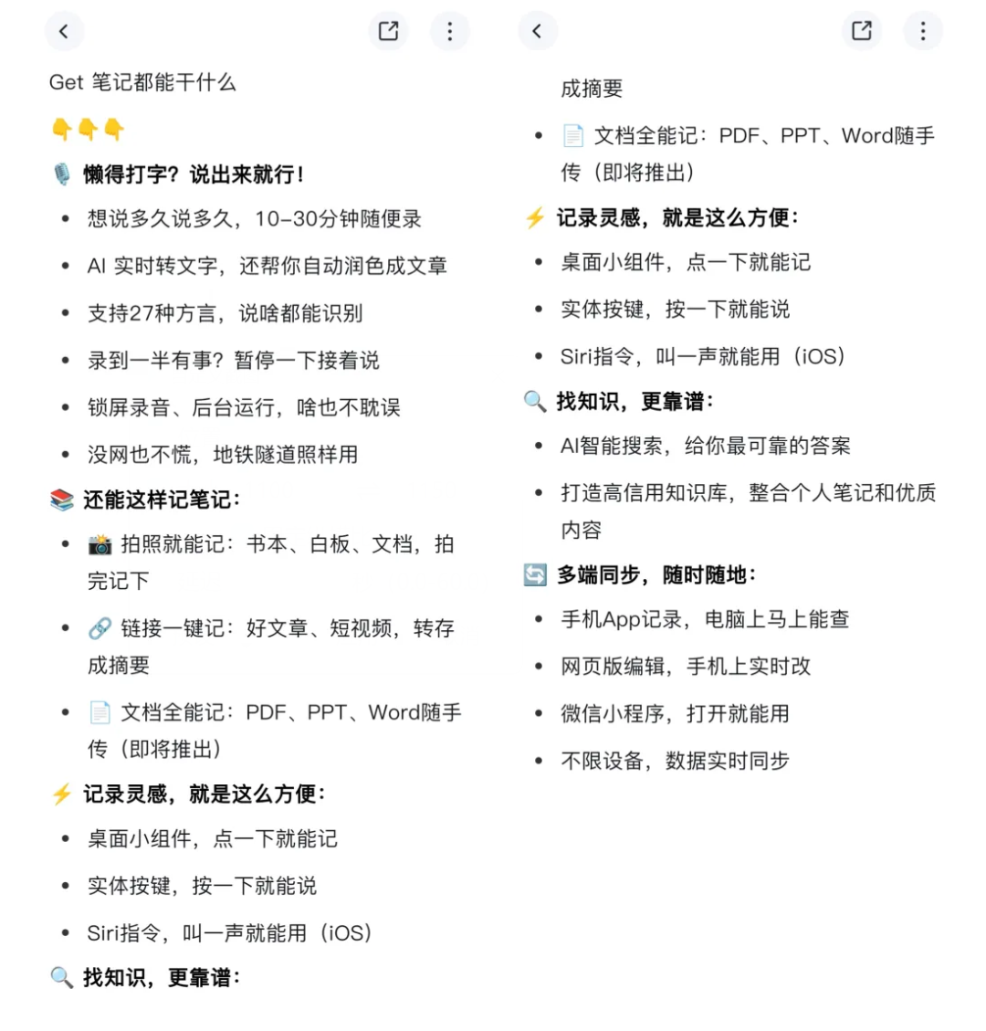 第二点,Get 笔记还给总结的内容加入表情。看起来就是很可爱,给我情绪价值,还能划分内容结构,有实用价值。建议所有能对网页总结的 AI 考虑加入表情,这感觉就像在微信上和真人对话,有种莫名其妙的舒适感。