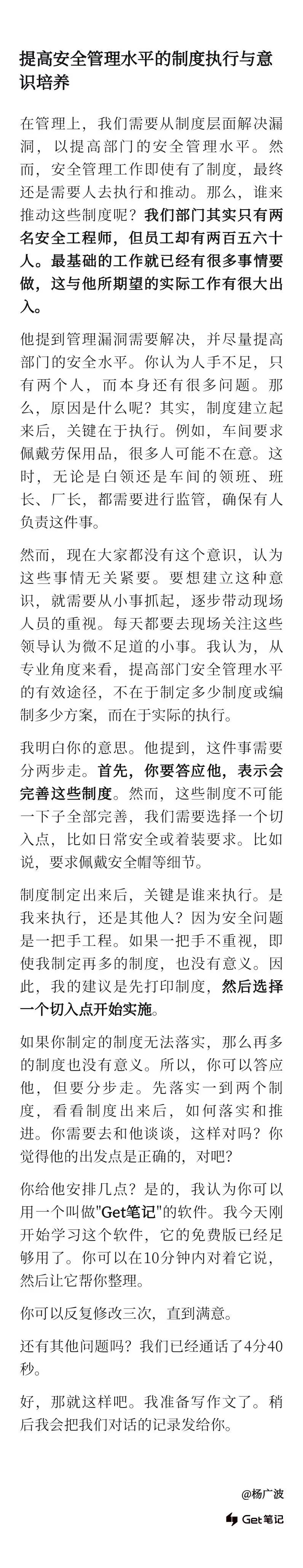在通话中,我们讨论了企业安全制度管理,我给了他一些建议。整个过程中,我用Get笔记软件全程录音。结束录音后,软件把我们的对话进行了简要整理。这让在魔都的表弟身上感受到了一丝震撼,确实很有帮助。