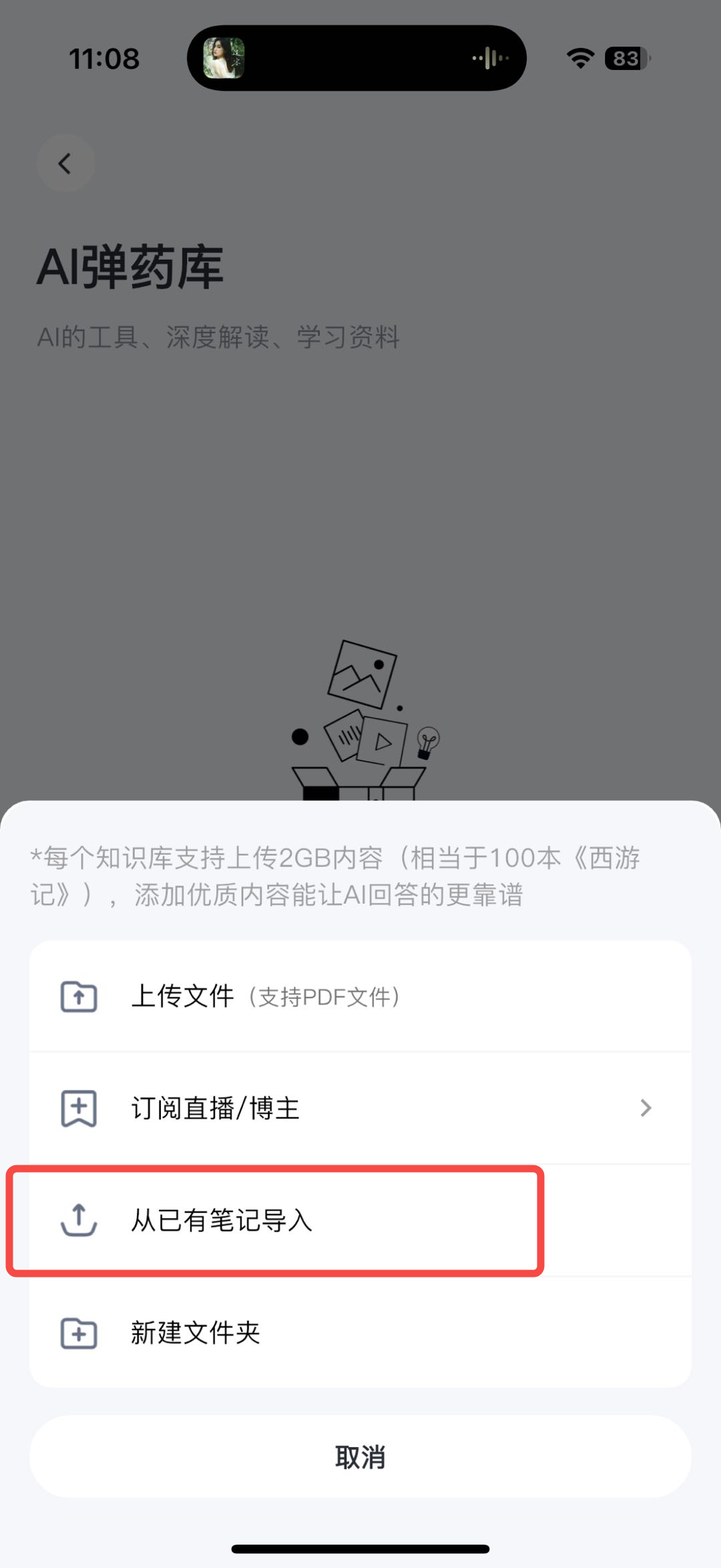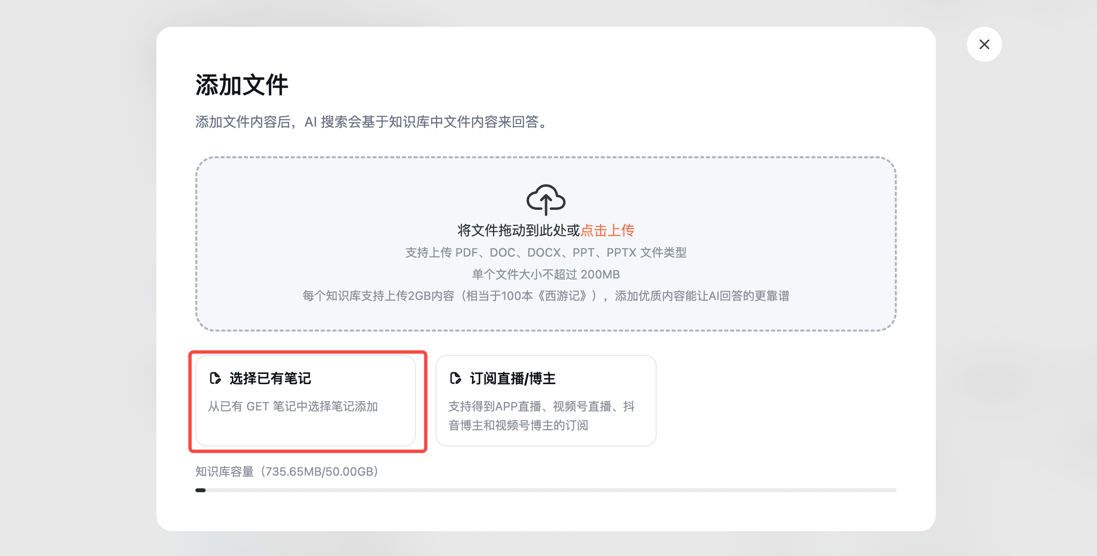 - 进入你创建的知识库,点击“添加”按钮,选择“选择已有笔记”