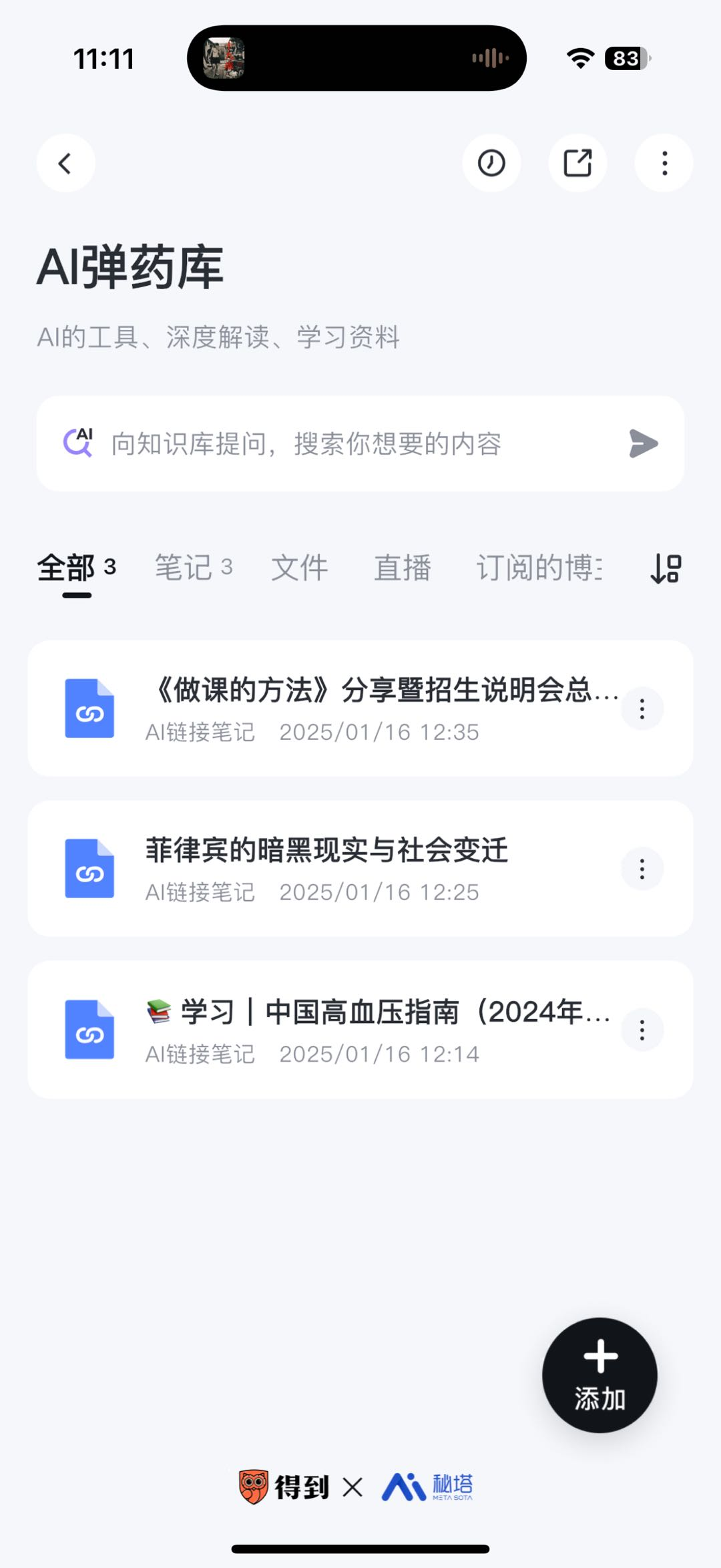 支持将现有的录音、文字、图片、链接等笔记直接添加到知识库,AI 自动分析整理,统一管理,让你的知识积累更全面、更有条理!