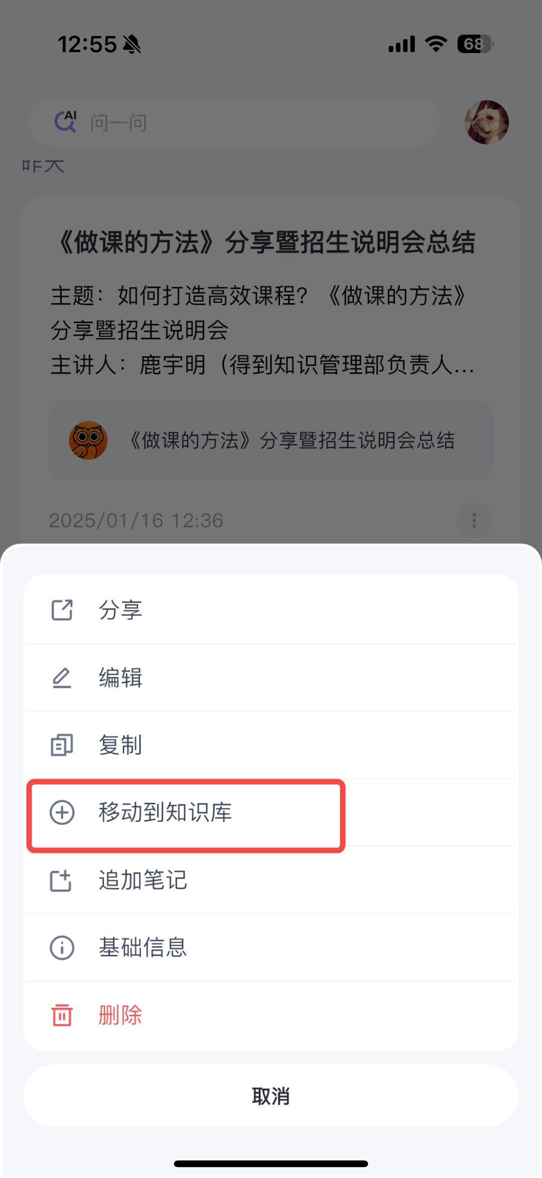 - 也可以从 Get 笔记首页,笔记列表中,点击笔记 ... 更多操作,选择你想加入的知识库,也支持直接移出