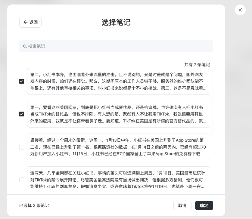 - 一次最多可以选中 100 条笔记加入