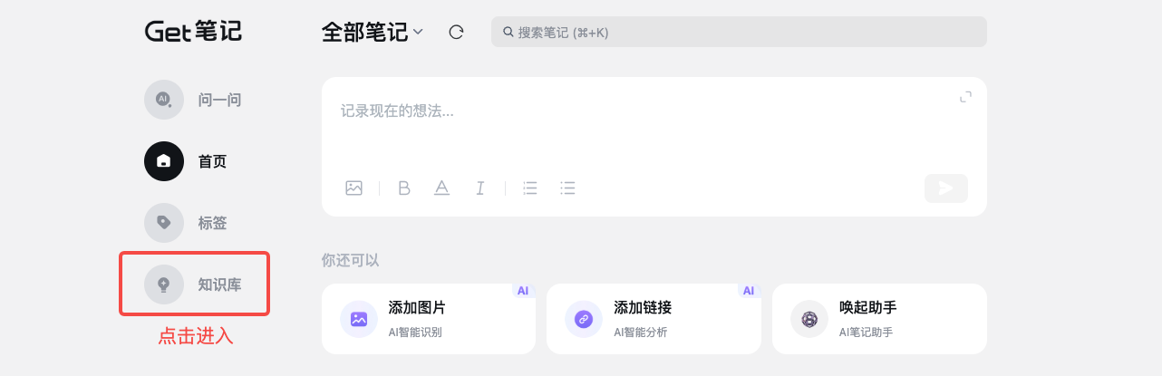 - 已开通内测的用户,可以看到左侧菜单上的“知识库”入口,点击进入知识库页面