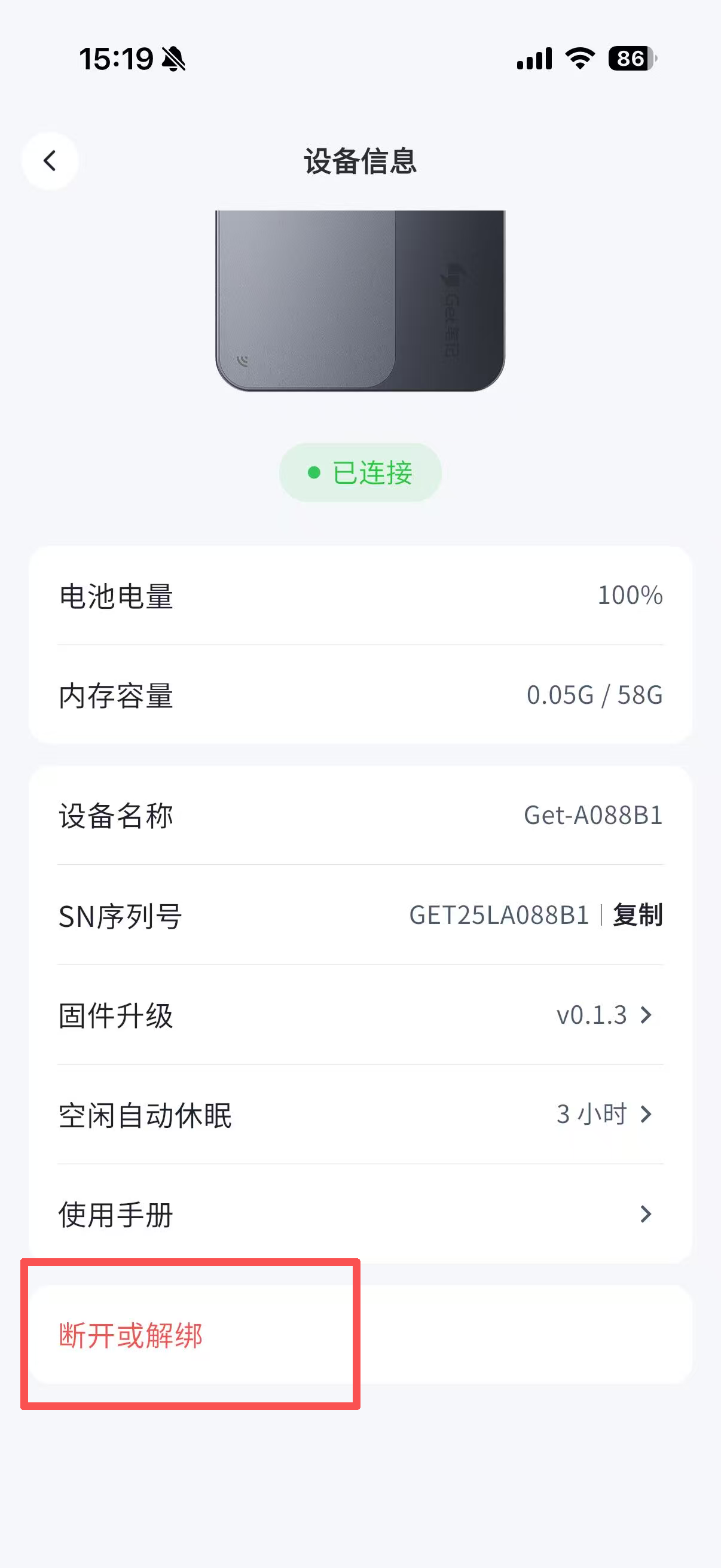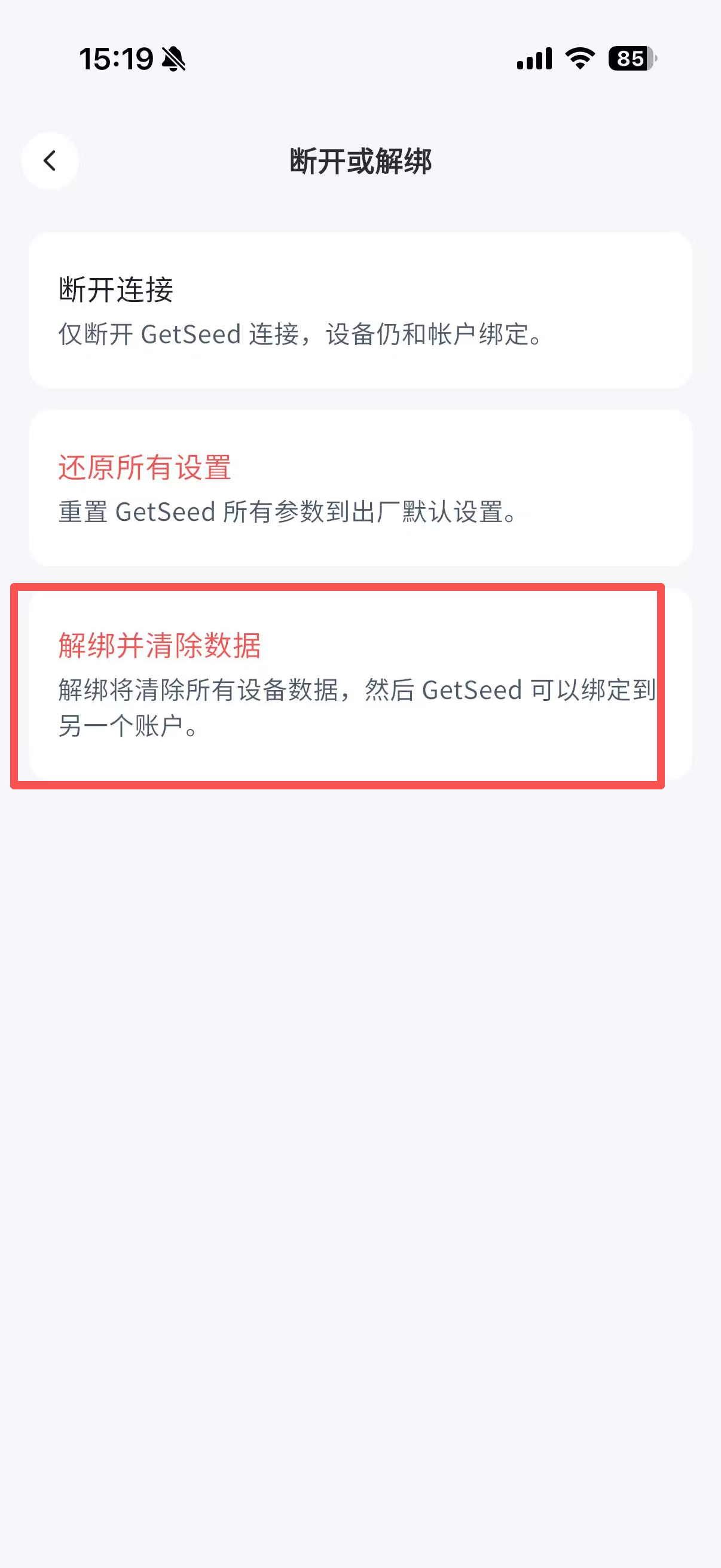 - 进入设备信息页面,滑到页面底部,选择「断开或解绑」,选择「解绑并清除数据」