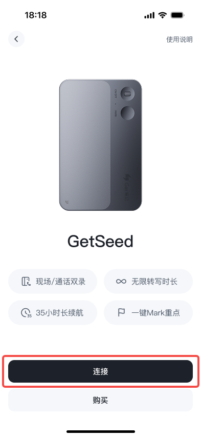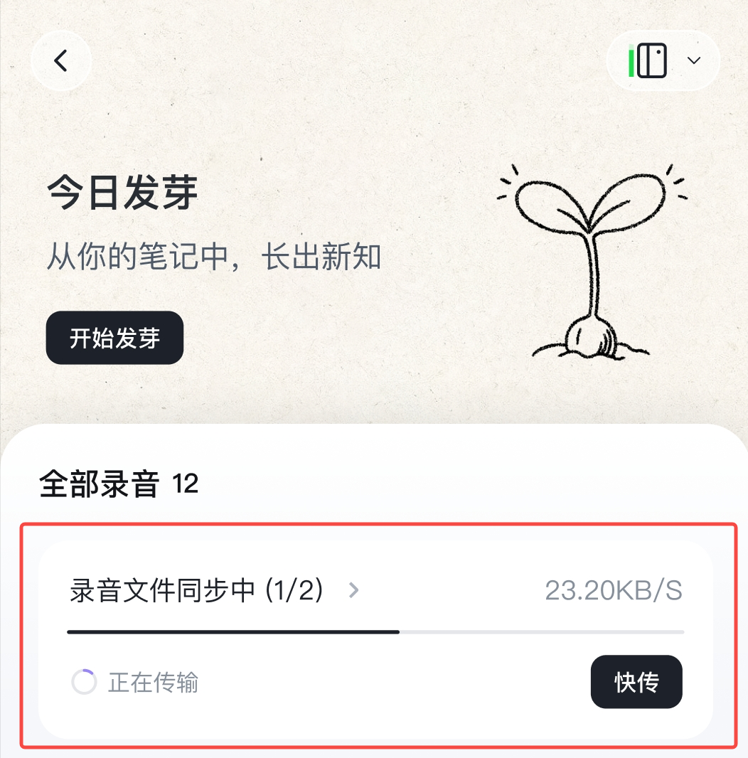 - 已连接后,点击首页「GetSeed 录音卡」入口,即可查看正在同步的录音,默认以蓝牙传输