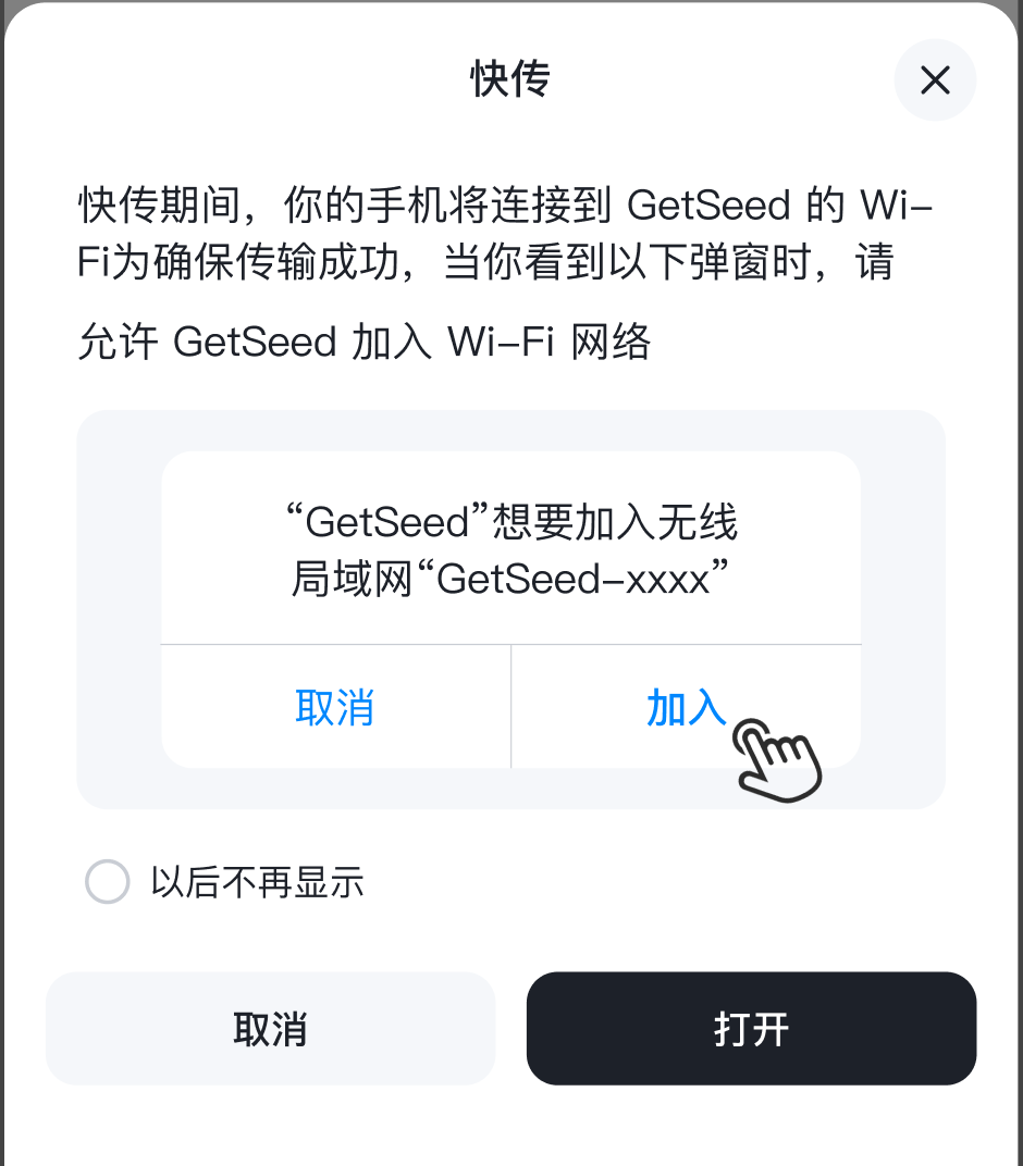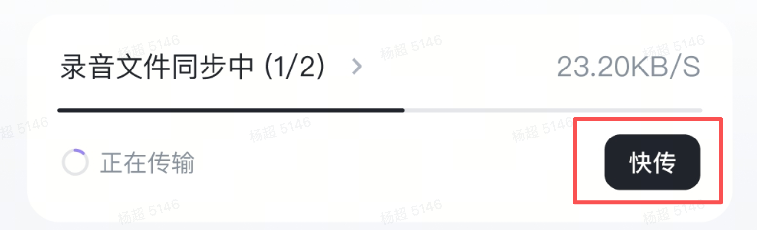 - WiFi 快传方式传输,录音文件传输中,点击 快传 按钮,加入设备无线局域网,可以更快传输速度进行录音文件上传
