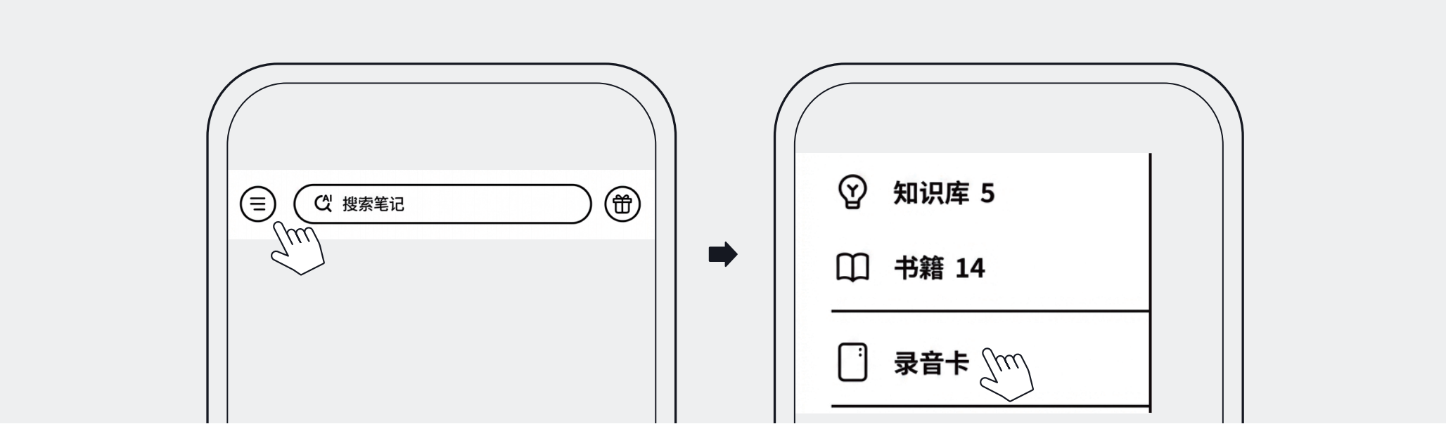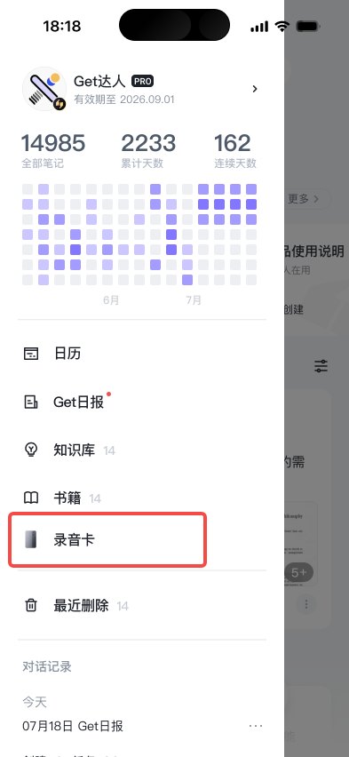 - 打开Get笔记APP,点击首页左上角打开侧边栏菜单,点击“录音卡”,按连接指引操作连接。连接完成后,指示灯将亮白灯常亮。