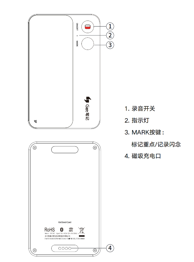 - 指示灯亮白灯闪烁,代表你的录音卡片已准备好与你的Get笔记APP连接绑定