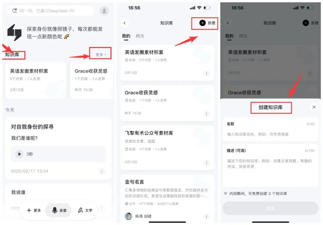 在Get笔记的首页,我们可以点击知识库➡️更多➡️新建,就可以搭建专属自己的知识库。比如:个人灵感,英语学习知识素材库等。
