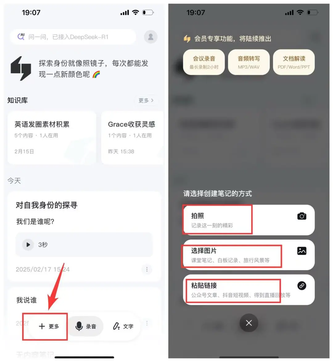 在Get笔记首页下方的菜单栏,点击➡️+更多,就可以选择拍照/选择图片/粘贴链接这些方式,将自己想要搜集的信息进行上传,进行AI识别,帮助自己在最短的时间内理解文本,抓取重点信息。