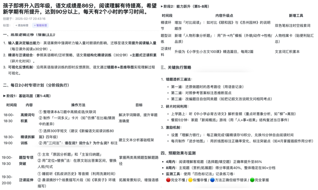 对话框输入提示词:学生的具体情况,包括年级,学科,当前成绩,薄弱环节,学习目标以及可投入的时间