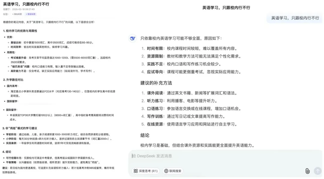 既然DeepSeek自身就可以实现AI内容的生成,为什么还要结合Get笔记呢?这个问题非常有趣,我们可以通过下面的两张对比图直观的感受出来。